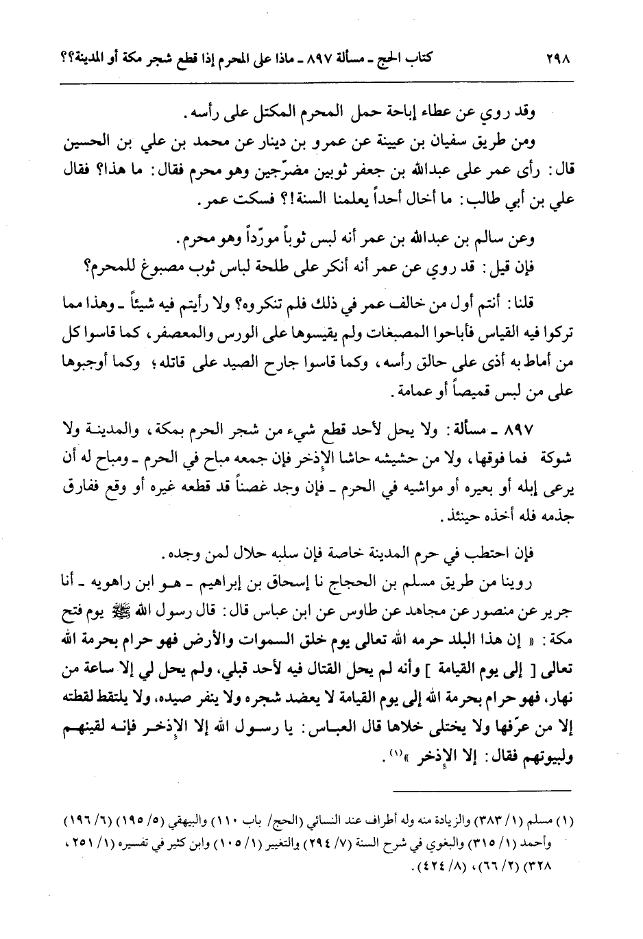 رُوِّينَا مِنْ طَرِيقِ مُسْلِمِ بْنِ الْحَجَّاجِ نَا إِسْحَاقُ بْنُ إبْرَاهِيمَ هُوَ ابْنُ رَاهْوَيْهِ - أَنَا جَرِيرٌ عَنْ مَنْصُورٍ عَنْ مُجَاهِدٍ عَنْ طَاوُسٍ عَنْ ابْنِ عَبَّاسٍ قَالَ: قَالَ رَسُولُ اللَّهِ - صَلَّى اللَّهُ عَلَيْهِ وَسَلَّمَ - يَوْمَ فَتْحِ مَكَّةَ: «إنَّ هَذَا الْبَلَدَ حَرَّمَهُ اللَّهُ تَعَالَى يَوْمَ خَلَقَ السَّمَاوَاتِ وَالْأَرْضَ فَهُوَ حَرَامٌ بِحُرْمَةٍ اللَّهِ تَعَالَى إلَى يَوْمِ الْقِيَامَةِ وَإِنَّهُ لَمْ يَحِلَّ الْقِتَالُ فِيهِ لِأَحَدٍ قَبْلِي، وَلَمْ يَحِلَّ لِي إلَّا سَاعَةً مِنْ نَهَارٍ، فَهُوَ حَرَامٌ بِحُرْمَةٍ اللَّهِ إلَى يَوْمِ الْقِيَامَةِ لَا يُعْضَدُ شَجَرُهُ وَلَا يُنَفَّرُ صَيْدُهُ، وَلَا يَلْتَقِطُ لُقَطَتَهُ إلَّا مَنْ عَرَّفَهَا وَلَا يُخْتَلَى خَلَاهَا قَالَ الْعَبَّاسُ: يَا رَسُولَ اللَّهِ إلَّا الْإِذْخِرَ فَإِنَّهُ لِقَيْنِهِمْ وَلِبُيُوتِهِمْ فَقَالَ: إلَّا الْإِذْخِرَ» .