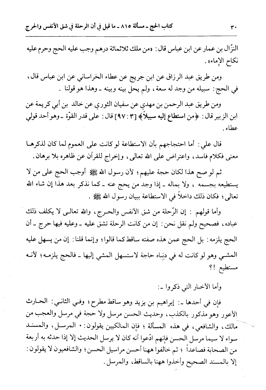 وَأَمَّا قَوْلُهُمْ: إنَّ الرِّحْلَةَ مِنْ شِقِّ الْأَنْفُسِ وَالْحَرَجِ، وَاَللَّهُ تَعَالَى لَا يُكَلِّفُ ذَلِكَ عِبَادَهُ، فَصَحِيحٌ وَلَمْ نَقُلْ نَحْنُ: إنَّ مَنْ كَانَتْ الرِّحْلَةُ تَشُقُّ عَلَيْهِ - وَعَلَيْهِ فِيهَا حَرَجٌ - أَنَّ الْحَجَّ يَلْزَمُهُ: بَلْ الْحَجُّ عَمَّنْ هَذِهِ صِفَتُهُ سَاقِطٌ كَمَا قَالُوا؛ وَإِنَّمَا قُلْنَا: إنَّ مَنْ يَسْهُلُ عَلَيْهِ الْمَشْيُ وَهُوَ لَوْ كَانَتْ لَهُ فِي دُنْيَاهُ حَاجَةٌ لَاسْتَسْهَلَ الْمَشْيَ إلَيْهَا - فَالْحَجُّ يَلْزَمُهُ؛ لِأَنَّهُ مُسْتَطِيعٌ؟ وَأَمَّا الْأَخْبَارُ الَّتِي ذَكَرُوا -: فَإِنَّ فِي أَحَدِهَا -: إبْرَاهِيمَ بْنَ يَزِيدَ وَهُوَ سَاقِطٌ مُطْرَحٌ؛ وَفِي الثَّانِي: الْحَارِثُ الْأَعْوَرُ وَهُوَ مَذْكُورٌ بِالْكَذِبِ، وَحَدِيثُ الْحَسَنِ مُرْسَلٌ وَلَا حُجَّةَ فِي مُرْسَلٍ وَالْعَجَبُ مِنْ مَالِكٍ، وَالشَّافِعِيِّ، فِي هَذِهِ الْمَسْأَلَةِ؛ فَإِنَّ الْمَالِكِيِّينَ يَقُولُونَ: الْمُرْسَلُ، وَالْمُسْنَدُ سَوَاءٌ لَا سِيَّمَا مُرْسَلُ الْحَسَنِ فَإِنَّهُمْ ادَّعَوْا أَنَّهُ كَانَ لَا يُرْسِلُ الْحَدِيثَ إلَّا إذَا حَدَّثَهُ بِهِ أَرْبَعَةٌ مِنْ الصَّحَابَةِ فَصَاعِدًا؛ ثُمَّ خَالَفُوا هَاهُنَا أَحْسَنَ مَرَاسِيلِ الْحَسَنِ؛ وَالشَّافِعِيُّونَ لَا يَقُولُونَ: إلَّا بِالْمُسْنَدِ الصَّحِيحِ وَأَخَذُوا هَاهُنَا بِالسَّاقِطِ، وَالْمُرْسَلِ.