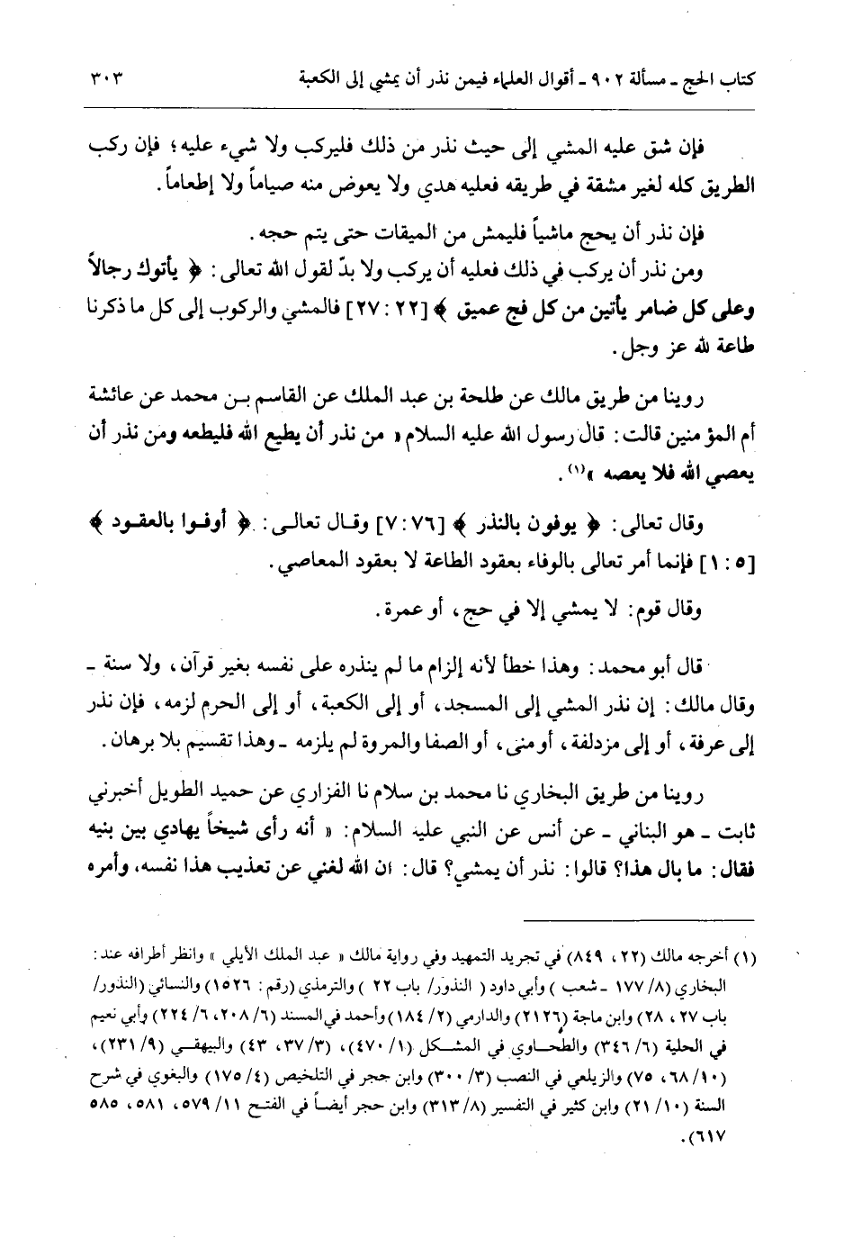 رُوِّينَا مِنْ طَرِيقِ الْبُخَارِيِّ نَا مُحَمَّدُ بْنُ سَلَّامٍ نَا الْفَزَارِيّ عَنْ حُمَيْدٍ الطَّوِيلِ أَخْبَرَنِي ثَابِتٌ هُوَ الْبُنَانِيُّ - عَنْ أَنَسٍ «عَنْ النَّبِيِّ - عَلَيْهِ السَّلَامُ -: أَنَّهُ رَأَى شَيْخًا يُهَادِي بَيْنَ بَنِيهِ فَقَالَ: مَا بَالُ هَذَا؟ قَالُوا: نَذَرَ أَنْ يَمْشِيَ قَالَ: إنَّ اللَّهَ لَغَنِيٌّ عَنْ تَعْذِيبِ هَذَا نَفْسَهُ، وَأَمَرَهُ