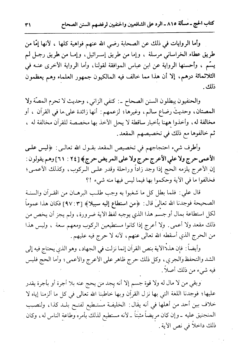 وَأَطْرَفُ شَيْءٍ احْتِجَاجُهُمْ فِي تَخْصِيصِ الْمُقْعَدِ بِقَوْلِ اللَّهِ تَعَالَى: {لَيْسَ عَلَى الأَعْمَى حَرَجٌ وَلا عَلَى الأَعْرَجِ حَرَجٌ وَلا عَلَى الْمَرِيضِ حَرَجٌ} [النور: 61] وَهُمْ يَقُولُونَ: إنَّ الْأَعْرَجَ يَلْزَمُهُ الْحَجُّ إذَا وَجَدَ زَادًا وَرَاحِلَةً وَقَدَرَ عَلَى الرُّكُوبِ، وَكَذَلِكَ الْأَعْمَى؛ فَخَالَفُوا مَا فِي الْآيَةِ وَحَكَمُوا بِهَا فِيمَا لَيْسَ فِيهَا مِنْهُ شَيْءٌ؟ قَالَ عَلِيٌّ: فَلَمَّا بَطَلَ كُلُّ مَا شَغَبُوا بِهِ وَجَبَ طَلَبُ الْبُرْهَانِ مِنْ الْقُرْآنِ وَالسُّنَّةِ الصَّحِيحَةِ فَوَجَدْنَا اللَّهَ تَعَالَى قَالَ: {مَنِ اسْتَطَاعَ إِلَيْهِ سَبِيلا} [آل عمران: 97] فَكَانَ هَذَا عُمُومًا لِكُلِّ اسْتِطَاعَةٍ بِمَالٍ أَوْ جِسْمٍ هَذَا الَّذِي يُوجِبُهُ لَفْظُ الْآيَةِ ضَرُورَةً، وَلَمْ يَجُزْ أَنْ يُخَصَّ مِنْ ذَلِكَ مُقْعَدٌ وَلَا أَعْمَى وَلَا أَعْرَجُ إذَا كَانُوا مُسْتَطِيعِينَ الرُّكُوبَ وَمَعَهُمْ سِعَةٌ، وَلَيْسَ هَذَا مِنْ الْحَرَجِ الَّذِي أَسْقَطَهُ اللَّهُ تَعَالَى عَنْهُمْ؛ لِأَنَّهُ لَا حَرَجَ فِيهِ عَلَيْهِمْ.