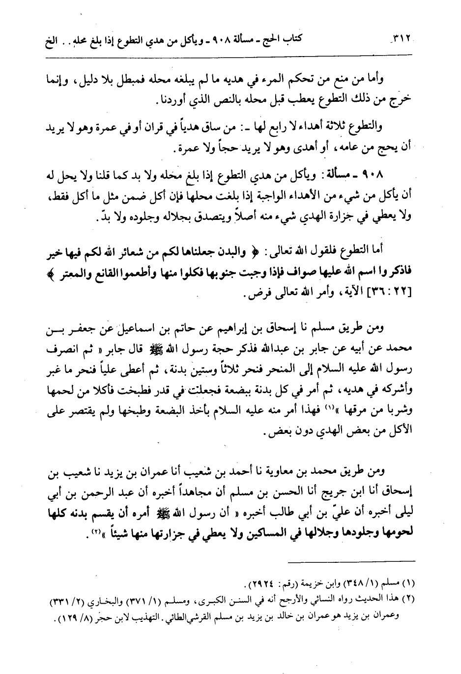 وَمِنْ طَرِيقِ مُسْلِمٍ نَا إِسْحَاقُ بْنُ إبْرَاهِيمَ عَنْ حَاتِمِ بْنِ إسْمَاعِيلَ عَنْ جَعْفَرَ بْنِ مُحَمَّدٍ عَنْ أَبِيهِ «عَنْ جَابِرِ بْنِ عَبْدِ اللَّهِ فَذَكَرَ حَجَّةَ رَسُولِ اللَّهِ - صَلَّى اللَّهُ عَلَيْهِ وَسَلَّمَ - قَالَ جَابِرٌ ثُمَّ انْصَرَفَ رَسُولُ اللَّهِ - عَلَيْهِ السَّلَامُ - إلَى الْمَنْحَرِ فَنَحَرَ ثَلَاثًا وَسِتِّينَ بَدَنَةً، ثُمَّ أَعْطَى عَلِيًّا فَنَحَرَ مَا غَبَرَ وَأَشْرَكَهُ فِي هَدْيِهِ، ثُمَّ أَمَرَ فِي كُلِّ بَدَنَةٍ بِبِضْعَةٍ فَجُعِلَتْ فِي قِدْرٍ فَطُبِخَتْ فَأَكَلَا مِنْ لَحْمِهَا وَشَرِبَا مِنْ مَرَقِهَا» فَهَذَا أَمْرٌ مِنْهُ - عَلَيْهِ السَّلَامُ - بِأَخْذِ الْبِضْعَةِ وَطَبْخِهَا وَلَمْ يَقْتَصِرْ عَلَى الْأَكْلِ مِنْ بَعْضِ الْهَدْيِ دُونَ بَعْضٍ.