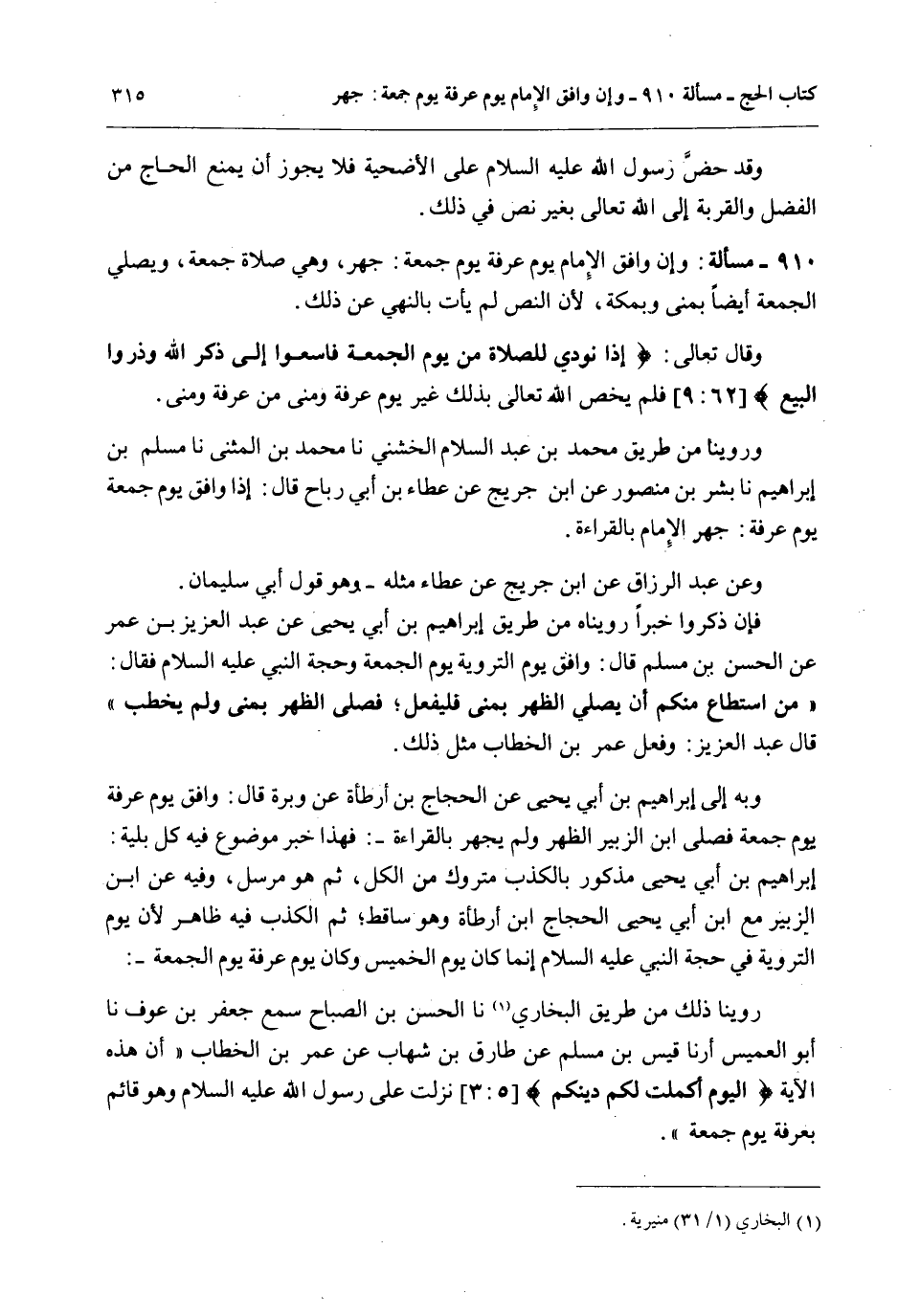 وَبِهِ إلَى إبْرَاهِيمَ بْنِ أَبِي يَحْيَى عَنْ الْحَجَّاجِ بْنِ أَرْطَاةَ عَنْ وَبَرَةَ قَالَ: وَافَقَ يَوْمُ عَرَفَةَ يَوْمَ جُمُعَةٍ فَصَلَّى ابْنُ الزُّبَيْرِ الظُّهْرَ وَلَمْ يَجْهَرْ بِالْقِرَاءَةِ -: فَهَذَا خَبَرٌ مَوْضُوعٌ فِيهِ كُلُّ بَلِيَّةٍ. إبْرَاهِيمُ بْنُ أَبِي يَحْيَى مَذْكُورٌ بِالْكَذِبِ مَتْرُوكٌ مِنْ الْكُلِّ، ثُمَّ هُوَ مُرْسَلٌ، وَفِيهِ عَنْ ابْنِ الزُّبَيْرِ مَعَ ابْنِ أَبِي يَحْيَى الْحَجَّاجِ بْنِ أَرْطَاةَ وَهُوَ سَاقِطٌ؛ ثُمَّ الْكَذِبُ فِيهِ ظَاهِرٌ؛ لِأَنَّ يَوْمَ التَّرْوِيَةِ فِي حَجَّةِ النَّبِيِّ - عَلَيْهِ السَّلَامُ - إنَّمَا كَانَ يَوْمَ الْخَمِيسِ وَكَانَ يَوْمُ عَرَفَةَ يَوْمَ الْجُمُعَةِ -: رُوِّينَا ذَلِكَ مِنْ طَرِيقِ الْبُخَارِيِّ نَا الْحَسَنُ بْنُ الصَّبَّاحِ سَمِعَ جَعْفَرَ بْنَ عَوْفٍ نَا أَبُو الْعَمِيسِ نَا قَيْسُ بْنُ مُسْلِمٍ عَنْ طَارِقِ بْنِ شِهَابٍ عَنْ عُمَرَ بْنِ الْخَطَّابِ " أَنَّ هَذِهِ الْآيَةَ {الْيَوْمَ أَكْمَلْتُ لَكُمْ دِينَكُمْ} [المائدة: 3] نَزَلَتْ عَلَى رَسُولِ اللَّهِ - عَلَيْهِ السَّلَامُ - وَهُوَ قَائِمٌ بِعَرَفَةَ يَوْمَ جُمُعَةٍ ".