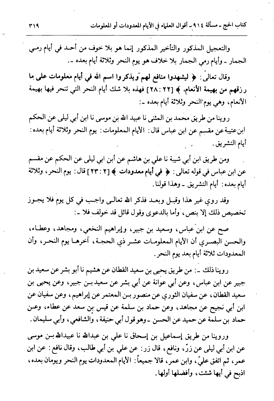 رُوِّينَا مِنْ طَرِيقِ مُحَمَّدِ بْنِ الْمُثَنَّى نَا عُبَيْدُ اللَّهِ بْنُ مُوسَى نَا ابْنُ أَبِي لَيْلَى عَنْ الْحَكَمِ بْنِ عُتَيْبَةَ عَنْ مِقْسَمٍ عَنْ ابْنِ عَبَّاسٍ قَالَ: الْأَيَّامُ الْمَعْلُومَاتُ: يَوْمُ النَّحْرِ وَثَلَاثَةُ أَيَّامٍ بَعْدَهُ: أَيَّامَ التَّشْرِيقِ.