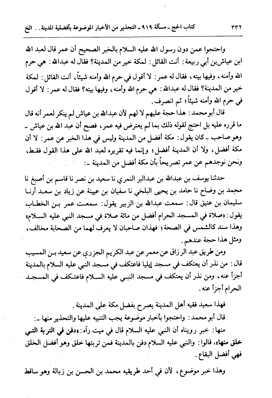 حَدَّثَنَا يُوسُفُ بْنُ عَبْدِ اللَّهِ بْنِ عَبْدِ الْبَرِّ النَّمَرِيُّ نَا سَعِيدُ بْنُ نَصْرٍ نَا قَاسِمُ بْنُ أَصْبَغَ نَا مُحَمَّدُ بْنُ وَضَّاحٍ نَا حَامِدُ بْنُ يَحْيَى الْبَلْخِيّ نَا سُفْيَانُ بْنُ عُيَيْنَةَ عَنْ زِيَادِ بْنِ سَعْدٍ نَا سُلَيْمَانُ بْنُ عَتِيقٍ قَالَ: سَمِعْتُ عَبْدَ اللَّهِ بْنَ الزُّبَيْرِ يَقُول: سَمِعْتُ عُمَرَ بْنَ الْخَطَّابِ يَقُول: " صَلَاةٌ فِي الْمَسْجِدِ الْحَرَامِ أَفْضَلُ مِنْ مِائَةِ صَلَاةٍ فِي مَسْجِدِ النَّبِيِّ - عَلَيْهِ السَّلَامُ - " وَهَذَا سَنَدٌ كَالشَّمْسِ فِي الصِّحَّةِ، فَهَذَانِ صَاحِبَانِ لَا يُعْرَفُ لَهُمَا مِنْ الصَّحَابَةِ مُخَالِفٌ، وَمِثْلُ هَذَا حُجَّةٌ عِنْدَهُمْ.