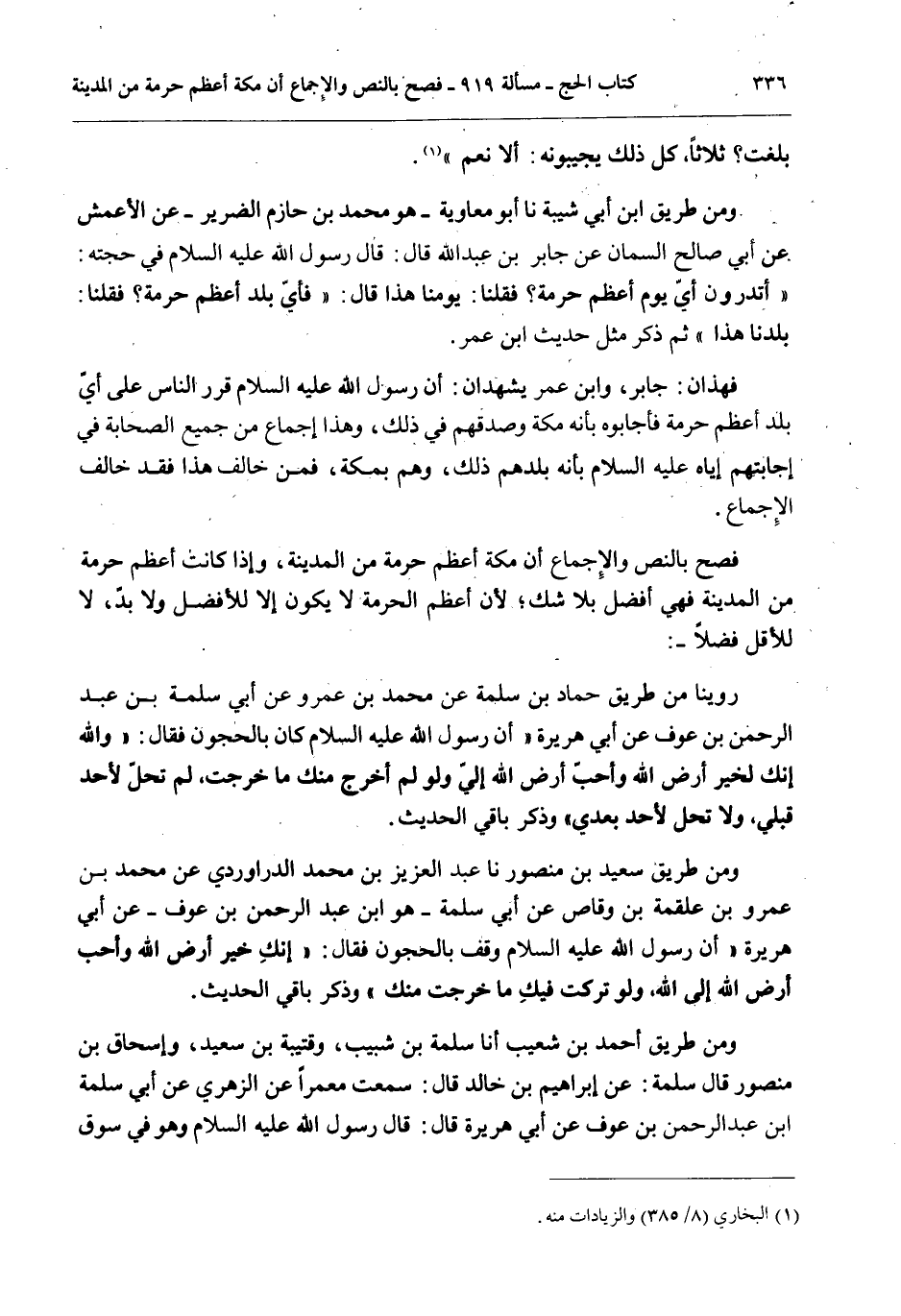 رُوِّينَا مِنْ طَرِيقِ حَمَّادِ بْنِ سَلَمَةَ عَنْ مُحَمَّدِ بْنِ عَمْرٍو عَنْ أَبِي سَلَمَةَ بْنِ عَبْدِ الرَّحْمَنِ بْنِ عَوْفٍ عَنْ أَبِي هُرَيْرَةَ «أَنَّ رَسُولَ اللَّهِ - عَلَيْهِ السَّلَامُ - كَانَ بِالْحَجُونِ فَقَالَ: وَاَللَّهِ إنَّكِ لَخَيْرُ أَرْضِ اللَّهِ وَأَحَبُّ أَرْضِ اللَّهِ إلَيَّ وَلَوْ لَمْ أُخْرَجْ مِنْكِ مَا خَرَجْتُ، لَمْ تَحِلَّ لِأَحَدٍ قَبْلِي، وَلَا تَحِلُّ لِأَحَدٍ بَعْدِي» وَذَكَرَ بَاقِيَ الْحَدِيثِ.