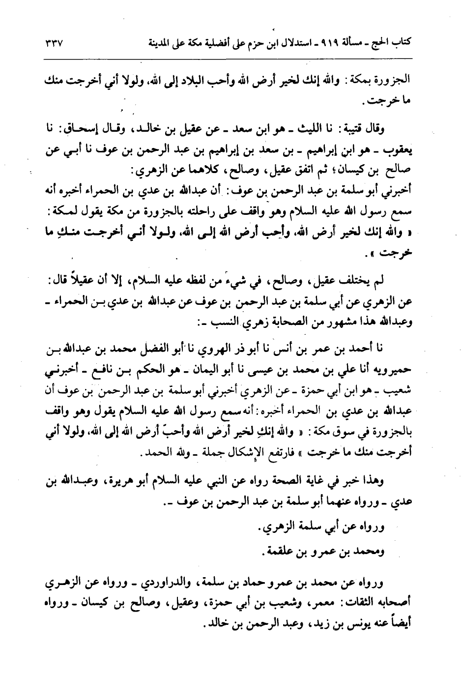 نَا أَحْمَدُ بْنُ عُمَرَ بْنِ أَنَسٍ نَا أَبُو ذَرٍّ الْهَرَوِيُّ نَا أَبُو الْفَضْلِ مُحَمَّدُ بْنُ عَبْدِ اللَّهِ بْنِ حُمَيْرَوَيْهِ نَا عَلِيُّ بْنُ مُحَمَّدِ بْنِ عِيسَى نَا أَبُو الْيَمَانِ هُوَ الْحَكَمُ بْنُ نَافِعٍ - أَخْبَرَنِي شُعَيْبٌ هُوَ ابْنُ أَبِي حَمْزَةَ - عَنْ الزُّهْرِيِّ أَخْبَرَنِي أَبُو سَلَمَةَ بْنُ عَبْدِ الرَّحْمَنِ بْنِ عَوْفٍ أَنَّ عَبْدَ اللَّهَ بْنَ عَدِيِّ بْنِ الْحَمْرَاءِ أَخْبَرَهُ: أَنَّهُ سَمِعَ رَسُولَ اللَّهِ - عَلَيْهِ السَّلَامُ - يَقُولُ وَهُوَ وَاقِفٌ بِالْجَزُورَةِ فِي سُوقِ مَكَّةَ: «وَاَللَّهِ إنَّكِ لَخَيْرُ أَرْضِ اللَّهِ وَأَحَبُّ أَرْضِ اللَّهِ إلَى اللَّهِ، وَلَوْلَا أَنِّي أُخْرِجْتُ مِنْكِ مَا خَرَجْتُ» فَارْتَفَعَ الْإِشْكَالُ جُمْلَةً - وَلِلَّهِ الْحَمْدُ.