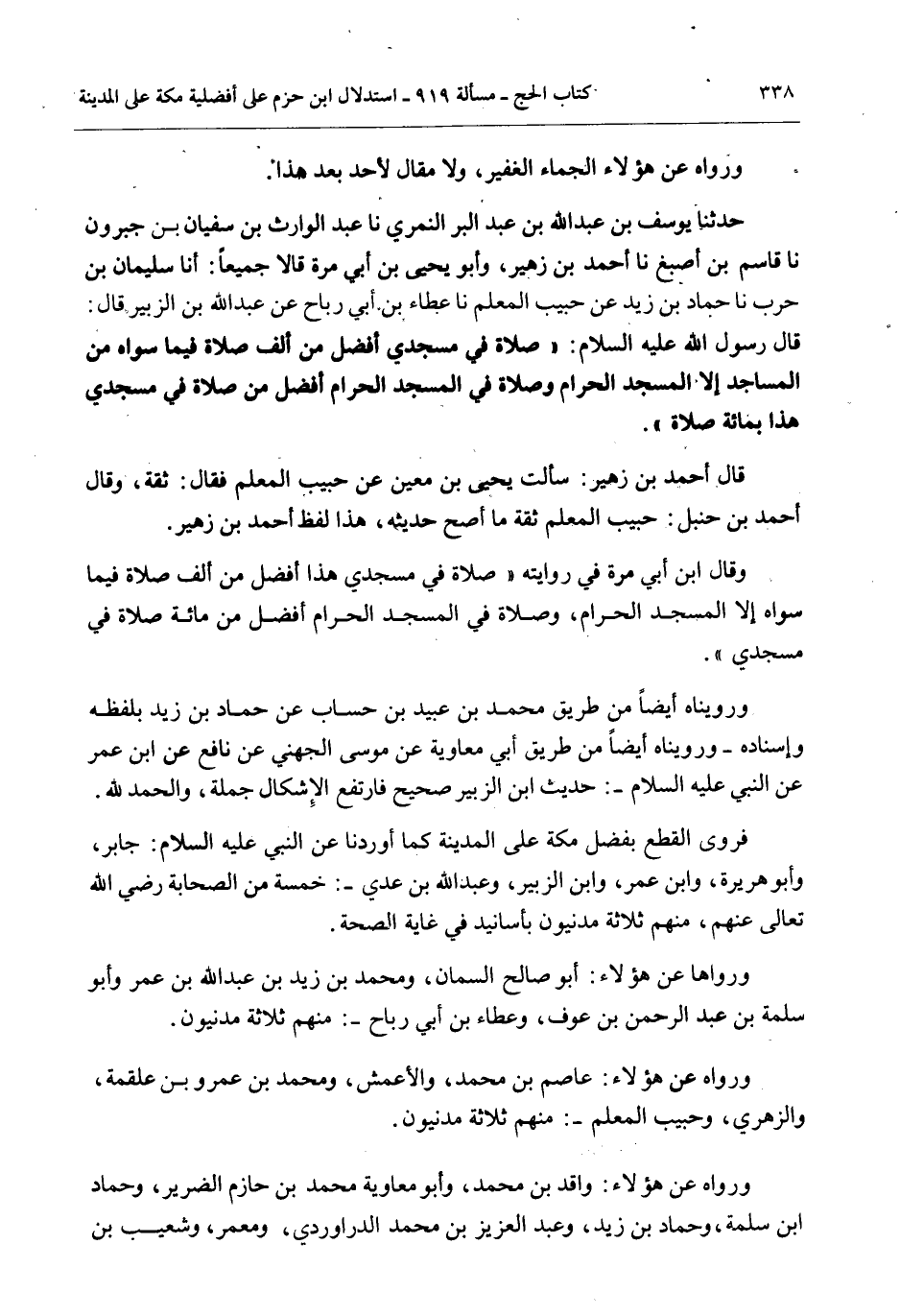 حَدَّثَنَا يُوسُفُ بْنُ عَبْدِ اللَّهِ بْنِ عَبْدِ الْبَرِّ النَّمَرِيُّ نَا عَبْدُ الْوَارِثِ بْنُ سُفْيَانَ بْنِ جَبْرُونَ نَا قَاسِمُ بْنُ أَصْبَغَ نَا أَحْمَدُ بْنُ زُهَيْرٍ، وَأَبُو يَحْيَى بْنُ أَبِي مُرَّةَ قَالَا جَمِيعًا: نَا سُلَيْمَانُ بْنُ حَرْبٍ نَا حَمَّادُ بْنُ زَيْدٍ عَنْ حَبِيبٍ الْمُعَلِّمِ نَا عَطَاءُ بْنُ أَبِي رَبَاحٍ عَنْ عَبْدِ اللَّهِ بْنِ الزُّبَيْرِ قَالَ: قَالَ رَسُولُ اللَّهِ - عَلَيْهِ السَّلَامُ -: «صَلَاةٌ فِي مَسْجِدِي أَفْضَلُ مِنْ أَلْفِ صَلَاةٍ فِيمَا سِوَاهُ مِنْ الْمَسَاجِدِ إلَّا الْمَسْجِدَ الْحَرَامَ وَصَلَاةٌ فِي الْمَسْجِدِ الْحَرَامِ أَفْضَلُ مِنْ صَلَاةٍ فِي مَسْجِدِي هَذَا بِمِائَةِ صَلَاةٍ» .