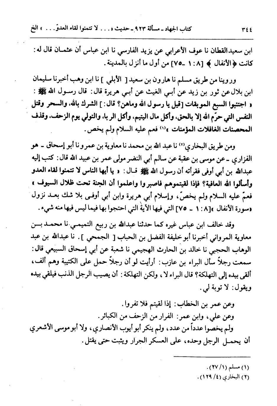 وَمِنْ طَرِيقِ الْبُخَارِيِّ نَا عَبْدُ اللَّهِ بْنُ مُحَمَّدٍ نَا مُعَاوِيَةُ بْنُ عَمْرٍو نَا أَبُو إِسْحَاقَ هُوَ الْفَزَارِيّ - عَنْ مُوسَى بْنِ عُقْبَةَ عَنْ سَالِمٍ أَبِي النَّضْرِ مَوْلَى عُمَرَ بْنِ عُبَيْدِ اللَّهِ قَالَ: كَتَبَ إلَيْهِ عَبْدُ اللَّهِ بْنُ أَبِي أَوْفَى فَقَرَأَتْهُ أَنَّ رَسُولَ اللَّهِ - صَلَّى اللَّهُ عَلَيْهِ وَسَلَّمَ - قَالَ: «يَا أَيُّهَا النَّاسُ لَا تَتَمَنَّوْا لِقَاءَ الْعَدُوِّ وَاسْأَلُوا اللَّهَ الْعَافِيَةَ؟ فَإِذَا لَقِيتُمُوهُمْ فَاصْبِرُوا وَاعْلَمُوا أَنَّ الْجَنَّةَ تَحْتَ ظِلَالِ السُّيُوفِ» فَعَمَّ - عَلَيْهِ السَّلَامُ - وَلَمْ يَخُصَّ، وَإِسْلَامُ أَبِي هُرَيْرَةَ وَابْنِ أَبِي أَوْفَى بِلَا شَكٍّ بَعْدَ نُزُولِ " سُورَةِ الْأَنْفَالِ " الَّتِي فِيهَا الْآيَةُ الَّتِي احْتَجُّوا بِهَا فِيمَا لَيْسَ فِيهَا مِنْهُ شَيْءٌ.