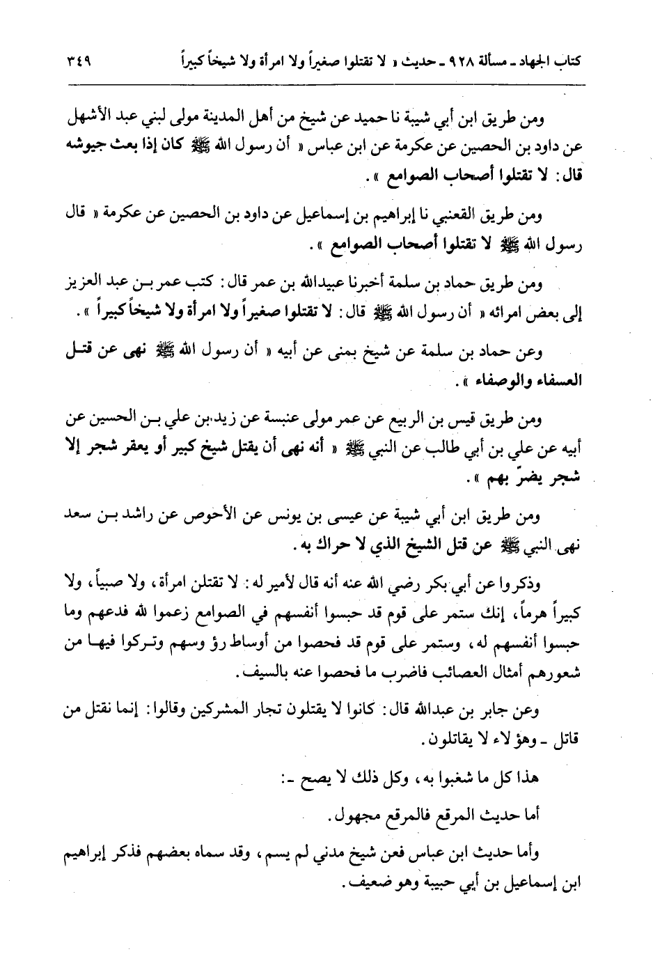 وَمِنْ طَرِيقِ حَمَّادِ بْنِ سَلَمَةَ أَخْبَرَنَا عُبَيْدُ اللَّهِ بْنُ عُمَرَ قَالَ: «كَتَبَ عُمَرُ بْنُ عَبْدِ الْعَزِيزِ إلَى بَعْضِ أُمَرَائِهِ أَنَّ رَسُولَ اللَّهِ - صَلَّى اللَّهُ عَلَيْهِ وَسَلَّمَ - قَالَ: لَا تَقْتُلُوا صَغِيرًا وَلَا امْرَأَةً وَلَا شَيْخًا كَبِيرًا» .