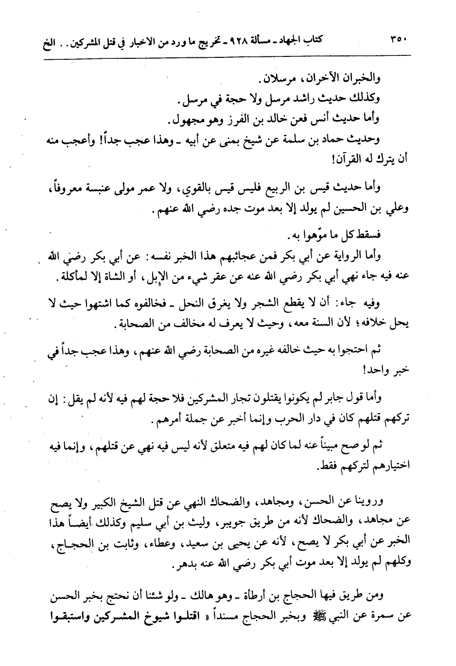 وَرُوِّينَا عَنْ الْحَسَنِ، وَمُجَاهِدٍ، وَالضَّحَّاكِ النَّهْيَ عَنْ قَتْلِ الشَّيْخِ الْكَبِيرِ وَلَا يَصِحُّ عَنْ مُجَاهِدٍ، وَالضَّحَّاكِ؛ لِأَنَّهُ مِنْ طَرِيقِ جُوَيْبِرٍ، وَلَيْثِ بْنِ أَبِي سُلَيْمٍ وَكَذَلِكَ أَيْضًا هَذَا الْخَبَرُ عَنْ أَبِي بَكْرٍ لَا يَصِحُّ؛ لِأَنَّهُ عَنْ يَحْيَى بْنِ سَعِيدٍ، وَعَطَاءٍ، وَثَابِتِ بْنِ الْحَجَّاجِ، وَكُلُّهُمْ لَمْ يُولَدْ إلَّا بَعْدَ مَوْتِ أَبِي بَكْرٍ - رَضِيَ اللَّهُ عَنْهُ - بِدَهْرٍ. وَمِنْ طَرِيقٍ فِيهَا الْحَجَّاجُ بْنُ أَرْطَاةَ - وَهُوَ هَالِكٌ - وَلَوْ شِئْنَا أَنْ نَحْتَجَّ بِخَبَرِ الْحَسَنِ عَنْ سَمُرَةَ عَنْ النَّبِيِّ - صَلَّى اللَّهُ عَلَيْهِ وَسَلَّمَ - وَبِخَبَرِ الْحَجَّاجِ مُسْنَدًا «اُقْتُلُوا شُيُوخَ الْمُشْرِكِينَ وَاسْتَبْقُوا
