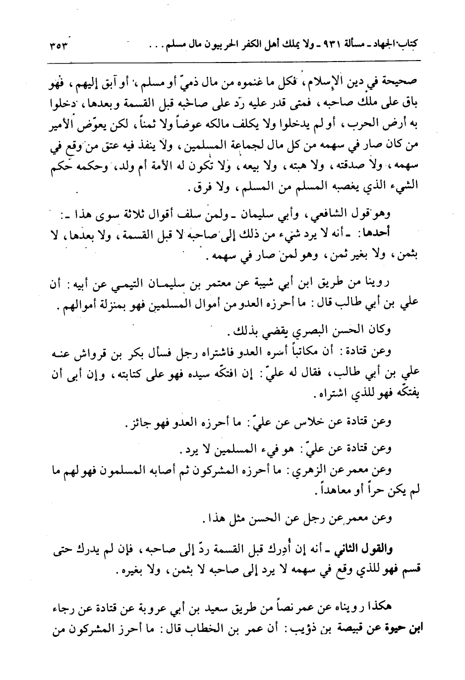 رُوِّينَا مِنْ طَرِيقِ ابْنِ أَبِي شَيْبَةَ عَنْ مُعْتَمِرِ بْنِ سُلَيْمَانَ التَّيْمِيِّ عَنْ أَبِيهِ: أَنَّ عَلِيَّ بْنَ أَبِي طَالِبٍ قَالَ: مَا أَحْرَزَهُ الْعَدُوُّ مِنْ أَمْوَالِ الْمُسْلِمِينَ فَهُوَ بِمَنْزِلَةِ أَمْوَالِهِمْ.