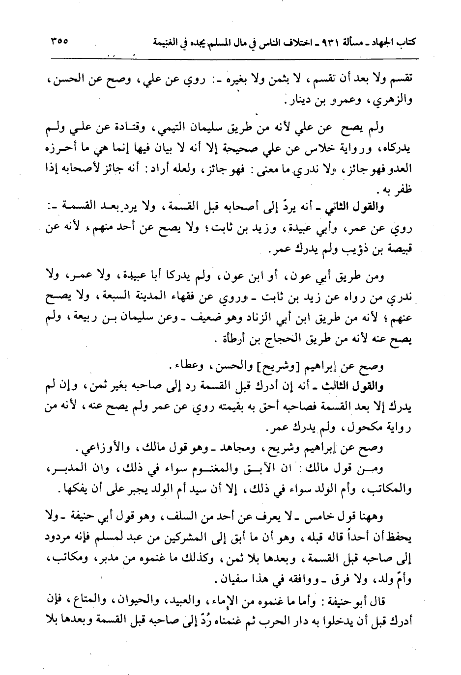 أَنَّهُ يُرَدُّ إلَى أَصْحَابِهِ قَبْلَ الْقِسْمَةِ، وَلَا يُرَدُّ بَعْدَ الْقِسْمَةِ، رُوِيَ عَنْ عُمَرَ، وَأَبِي عُبَيْدَةَ، وَزَيْدِ بْنِ ثَابِتٍ؛ وَلَا يَصِحُّ عَنْ أَحَدٍ مِنْهُمْ، لِأَنَّهُ عَنْ قَبِيصَةَ بْنِ ذُؤَيْبٍ وَلَمْ يُدْرِكْ عُمَرَ، وَمِنْ طَرِيقِ أَبِي عَوْنٍ، أَوْ ابْنِ عَوْنٍ، وَلَمْ يُدْرِكَا أَبَا عُبَيْدَةَ، وَلَا عُمَرَ، وَلَا نَدْرِي مَنْ رَوَاهُ عَنْ زَيْدِ بْنِ ثَابِتٍ - وَرُوِيَ عَنْ فُقَهَاءِ الْمَدِينَةِ السَّبْعَةِ، وَلَا يَصِحُّ عَنْهُمْ، لِأَنَّهُ مِنْ طَرِيقِ ابْنِ أَبِي الزِّنَادِ هُوَ ضَعِيفٌ - وَعَنْ سُلَيْمَانَ بْنِ رَبِيعَةَ، وَلَمْ يَصِحَّ عَنْهُ لِأَنَّهُ مِنْ طَرِيقِ الْحَجَّاجِ بْنِ أَرْطَاةَ. وَصَحَّ عَنْ إبْرَاهِيمَ [وَشُرَيْحٍ] وَالْحَسَنِ وَعَطَاءٍ.
