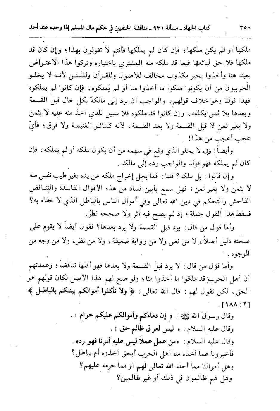 مَلَكَهَا أَوْ لَمْ يَكُنْ مَلَكَهَا؛ فَإِنْ كَانَ لَمْ يَمْلِكْهَا فَأَنْتُمْ لَا تَقُولُونَ بِهَذَا؛ وَإِنْ كَانَ قَدْ مَلَكَهَا فَلَا حَقَّ لِبَائِعِهَا فِيمَا قَدْ مَلَكَهُ مِنْهُ الْمُشْتَرِي بِاخْتِيَارِهِ وَتَرَكُوا هَذَا الِاعْتِرَاضَ بِعَيْنِهِ هُنَا وَأَخَذُوا بِخَبَرٍ مَكْذُوبٍ مُخَالِفٍ لِلْأُصُولِ وَلِلْقُرْآنِ وَلِلسُّنَنِ لِأَنَّهُ لَا يَخْلُو الْحَرْبِيُّونَ مِنْ أَنْ يَكُونُوا مَلَكُوا مَا أَخَذُوا مِنَّا أَوْ لَمْ يَمْلِكُوهُ، فَإِنْ كَانُوا لَمْ يَمْلِكُوهُ فَهَذَا قَوْلُنَا وَهُوَ خِلَافُ قَوْلِهِمْ، وَالْوَاجِبُ أَنْ يُرَدَّ إلَى مَالِكِهِ بِكُلِّ حَالٍ قَبْلَ الْقِسْمَةِ وَبَعْدَهَا بِلَا ثَمَنٍ يُكَلَّفُهُ، وَإِنْ كَانُوا قَدْ مَلَكُوهُ فَلَا سَبِيلَ لِلَّذِي أُخِذَ مِنْهُ عَلَيْهِ لَا بِثَمَنٍ وَلَا بِغَيْرِ ثَمَنٍ لَا قَبْلَ الْقِسْمَةِ وَلَا بَعْدَ الْقِسْمَةِ، لِأَنَّهُ كَسَائِرِ الْغَنِيمَةِ وَلَا فَرْقَ؛ فَأَيُّ عَجَبٍ أُعْجِبُ مِنْ هَذَا
