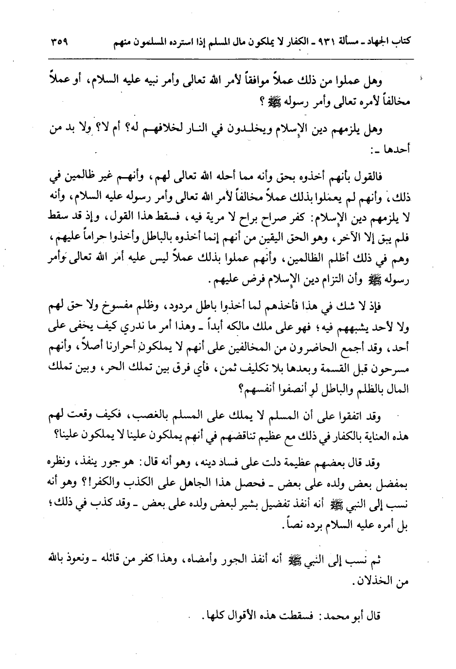 وَهَلْ عَمِلُوا مِنْ ذَلِكَ عَمَلًا مُوَافِقًا لِأَمْرِ اللَّهِ تَعَالَى وَأَمْرِ نَبِيِّهِ - عَلَيْهِ السَّلَامُ -، أَوْ عَمَلًا مُخَالِفًا لِأَمْرِهِ تَعَالَى وَأَمْرِ رَسُولِهِ - صَلَّى اللَّهُ عَلَيْهِ وَسَلَّمَ -؟ وَهَلْ يَلْزَمُهُمْ دِينُ الْإِسْلَامِ وَيَخْلُدُونَ فِي النَّارِ لِخِلَافِهِمْ لَهُ أَمْ لَا؟ وَلَا بُدَّ مِنْ أَحَدِهَا. فَالْقَوْلُ بِأَنَّهُمْ أَخَذُوهُ بِحَقٍّ أَنَّهُ مِمَّا أَحَلَّهُ اللَّهُ تَعَالَى لَهُمْ وَأَنَّهُمْ غَيْرُ ظَالِمِينَ فِي ذَلِكَ، وَأَنَّهُمْ لَمْ يَعْمَلُوا بِذَلِكَ عَمَلًا مُخَالِفًا لِأَمْرِ اللَّهِ تَعَالَى وَأَمْرِ رَسُولِهِ - عَلَيْهِ السَّلَامُ -، وَأَنَّهُ لَا يَلْزَمُهُمْ دِينُ الْإِسْلَامِ: كُفْرٌ صُرَاحٌ بَرَاحٌ لَا مِرْيَةَ فِيهِ، فَسَقَطَ هَذَا الْقَوْلُ، وَإِذْ قَدْ سَقَطَ فَلَمْ يَبْقَ إلَّا الْآخَرُ، وَهُوَ الْحَقُّ الْيَقِينُ مِنْ أَنَّهُمْ إنَّمَا أَخَذُوهُ بِالْبَاطِلِ وَأَخَذُوا حَرَامًا عَلَيْهِمْ، وَهُمْ فِي ذَلِكَ أُظْلَمُ الظَّالِمِينَ، وَأَنَّهُمْ عَمِلُوا بِذَلِكَ عَمَلًا لَيْسَ عَلَيْهِ أَمْرُ اللَّهِ تَعَالَى: وَأَمْرُ رَسُولِهِ - صَلَّى اللَّهُ عَلَيْهِ وَسَلَّمَ - وَأَنَّ الْتِزَامَ دِينِ الْإِسْلَامِ فَرْضٌ عَلَيْهِمْ.