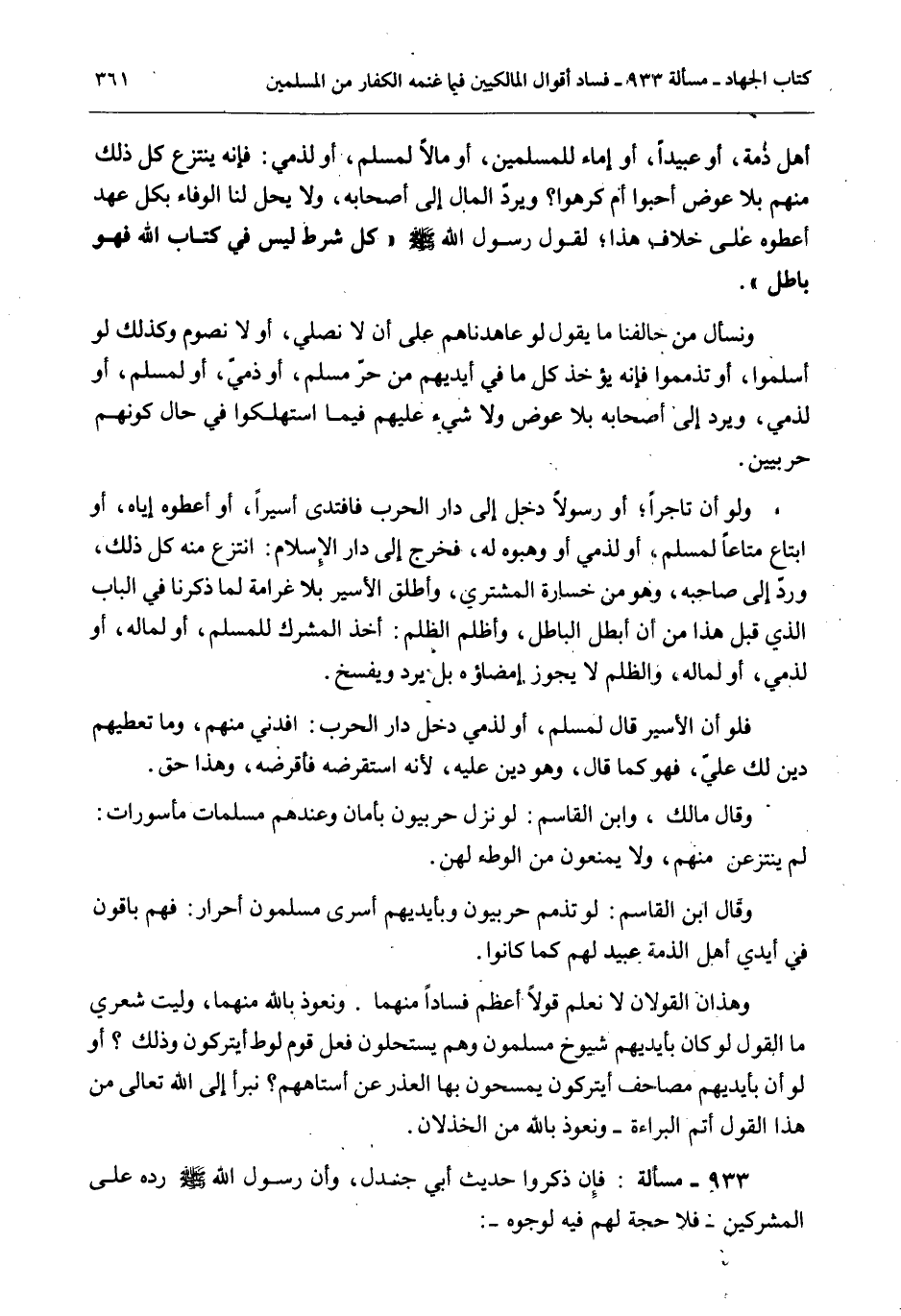 أَهْلَ ذِمَّةٍ، أَوْ عَبِيدًا، أَوْ إمَاءً لِلْمُسْلِمِينَ، أَوْ مَالًا لِمُسْلِمٍ، أَوْ لِذِمِّيٍّ: فَإِنَّهُ يُنْتَزَعُ كُلُّ ذَلِكَ مِنْهُمْ بِلَا عِوَضٍ أَحَبُّوا أَمْ كَرِهُوا. وَيُرَدُّ الْمَالُ إلَى أَصْحَابِهِ، وَلَا يَحِلُّ لَنَا الْوَفَاءُ بِكُلِّ عَهْدٍ أُعْطُوهُ عَلَى خِلَافِ هَذَا؛ لِقَوْلِ رَسُولِ اللَّهِ - صَلَّى اللَّهُ عَلَيْهِ وَسَلَّمَ - «كُلُّ شَرْطٍ لَيْسَ فِي كِتَابِ اللَّهِ فَهُوَ بَاطِلٌ» .