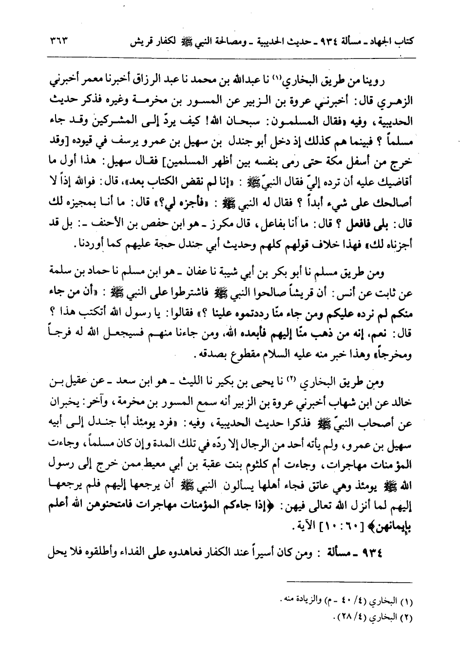 رُوِّينَا مِنْ طَرِيقِ الْبُخَارِيِّ نَا عَبْدُ اللَّهِ بْنُ مُحَمَّدٍ نَا عَبْدُ الرَّزَّاقِ أَخْبَرَنَا مَعْمَرٌ أَخْبَرَنِي الزُّهْرِيُّ قَالَ: أَخْبَرَنِي عُرْوَةُ بْنُ الزُّبَيْرِ «عَنْ الْمِسْوَرِ بْنِ مَخْرَمَةَ وَغَيْرِهِ فَذَكَرَ حَدِيثَ الْحُدَيْبِيَةِ، وَفِيهِ فَقَالَ الْمُسْلِمُونَ: سُبْحَانَ اللَّهِ كَيْفَ يُرَدُّ إلَى الْمُشْرِكِينَ وَقَدْ جَاءَ مُسْلِمًا؟ فَبَيْنَمَا هُمْ كَذَلِكَ إذْ دَخَلَ أَبُو جَنْدَلِ بْنُ سُهَيْلِ بْنِ عَمْرٍو يَرْسُفُ فِي قُيُودِهِ وَقَدْ خَرَجَ مِنْ أَسْفَلِ مَكَّةَ حَتَّى رَمَى بِنَفْسِهِ بَيْنَ أَظْهُرِ الْمُسْلِمِينَ فَقَالَ سُهَيْلٌ: هَذَا أَوَّلُ مَا أُقَاضِيكَ عَلَيْهِ أَنْ تَرُدَّهُ إلَيَّ فَقَالَ النَّبِيُّ - صَلَّى اللَّهُ عَلَيْهِ وَسَلَّمَ -: إنَّا لَمْ نَقْضِ الْكِتَابَ بَعْدُ، قَالَ: فَوَاَللَّهِ إذًا لَا أُصَالِحُكَ عَلَى شَيْءٍ أَبَدًا، فَقَالَ لَهُ النَّبِيُّ - صَلَّى اللَّهُ عَلَيْهِ وَسَلَّمَ -: فَأَجِزْهُ لِي قَالَ: مَا أَنَا بِمُجِيزِهِ لَكَ قَالَ: بَلَى فَافْعَلْ. قَالَ: مَا أَنَا بِفَاعِلٍ، قَالَ مُكَرَّزٌ - هُوَ ابْنُ حَفْصِ بْنِ الْأَحْنَفِ: بَلْ قَدْ أَجَزْنَاهُ لَكَ» فَهَذَا خِلَافُ قَوْلِهِمْ كُلِّهِمْ وَحَدِيثُ أَبِي جَنْدَلٍ حُجَّةٌ عَلَيْهِمْ كَمَا أَوْرَدْنَا.