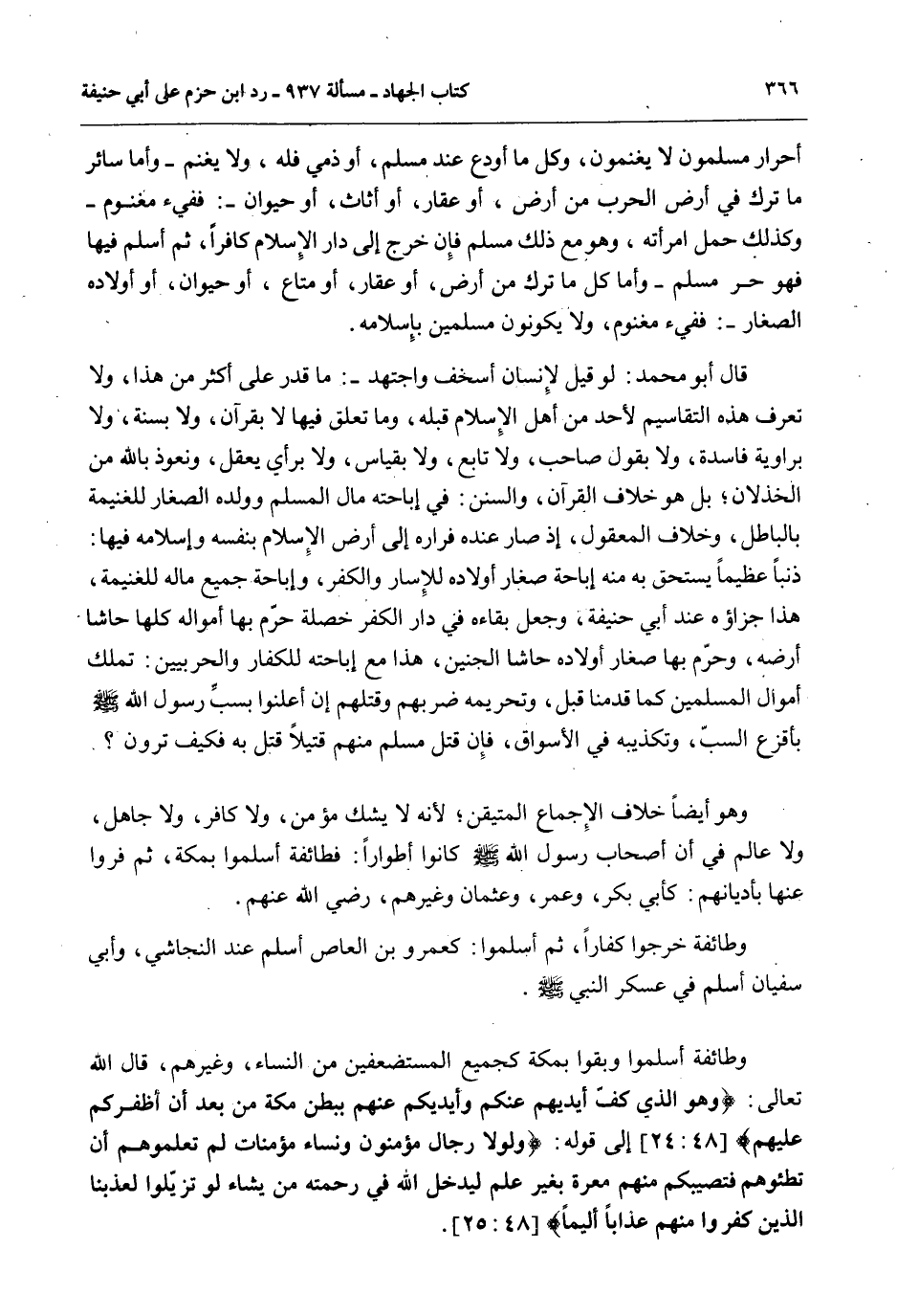 قَالَ أَبُو مُحَمَّدٍ: لَوْ قِيلَ لِإِنْسَانٍ أَسْخِفْ وَاجْتَهِدْ مَا قَدَرَ عَلَى أَكْثَرَ مِنْ هَذَا، وَلَا تُعْرَفُ هَذِهِ التَّقَاسِيمُ لِأَحَدٍ مِنْ أَهْلِ الْإِسْلَامِ قَبْلَهُ، وَمَا تَعَلُّقَ فِيهَا لَا بِقُرْآنٍ، وَلَا بِسُنَّةٍ، وَلَا بِرِوَايَةٍ فَاسِدَةٍ، وَلَا بِقَوْلِ صَاحِبٍ، وَلَا تَابِعٍ، وَلَا بِقِيَاسٍ، وَلَا بِرَأْيٍ يُعْقَلُ، وَنَعُوذُ بِاَللَّهِ مِنْ الْخِذْلَانِ؛ بَلْ هُوَ خِلَافُ الْقُرْآنِ، وَالسُّنَنِ: فِي إبَاحَتِهِ مَالَ الْمُسْلِمِ وَوَلَدِهِ الصِّغَارِ لِلْغَنِيمَةِ بِالْبَاطِلِ، وَخِلَافُ الْمَعْقُولِ، إذْ صَارَ عِنْدَهُ فِرَارُهُ إلَى أَرْضِ الْإِسْلَامِ بِنَفْسِهِ وَإِسْلَامُهُ فِيهَا: ذَنْبًا عَظِيمًا يَسْتَحِقُّ بِهِ مِنْهُ إبَاحَةَ صِغَارِ أَوْلَادِهِ لِلْإِسَارِ وَالْكُفْرِ، وَإِبَاحَةَ جَمِيعِ مَالِهِ لِلْغَنِيمَةِ، هَذَا جَزَاؤُهُ عِنْدَ أَبِي حَنِيفَةَ، وَجَعَلَ بَقَاءَهُ فِي دَارِ الْكُفْرِ خُصْلَةً حَرَّمَ بِهَا أَمْوَالَهُ كُلَّهَا حَاشَا أَرْضَهُ، وَحَرَّمَ بِهَا صِغَارَ أَوْلَادِهِ حَاشَا الْجَنِينِ، هَذَا مَعَ إبَاحَتِهِ لِلْكُفَّارِ وَالْحَرْبِيِّينَ: تَمَلُّكَ أَمْوَالِ الْمُسْلِمِينَ كَمَا قَدَّمْنَا قَبْلُ، وَتَحْرِيمِهِ ضَرْبَهُمْ وَقَتْلَهُمْ إنْ أَعْلَنُوا بِسَبِّ رَسُولِ اللَّهِ - صَلَّى اللَّهُ عَلَيْهِ وَسَلَّمَ - بِأَقْزَعِ السَّبِّ، وَتَكْذِيبِهِ فِي الْأَسْوَاقِ، فَإِنْ قَتَلَ مُسْلِمٌ مِنْهُمْ قَتِيلًا قُتِلَ بِهِ فَكَيْفَ تَرَوْنَ؟ وَهُوَ أَيْضًا خِلَافُ الْإِجْمَاعِ الْمُتَيَقَّنِ؛ لِأَنَّهُ لَا يَشُكُّ مُؤْمِنٌ، وَلَا كَافِرٌ، وَلَا جَاهِلٌ، وَلَا عَالَمٌ فِي أَنَّ أَصْحَابَ رَسُولِ اللَّهِ - صَلَّى اللَّهُ عَلَيْهِ وَسَلَّمَ - كَانُوا أَطْوَارًا.
