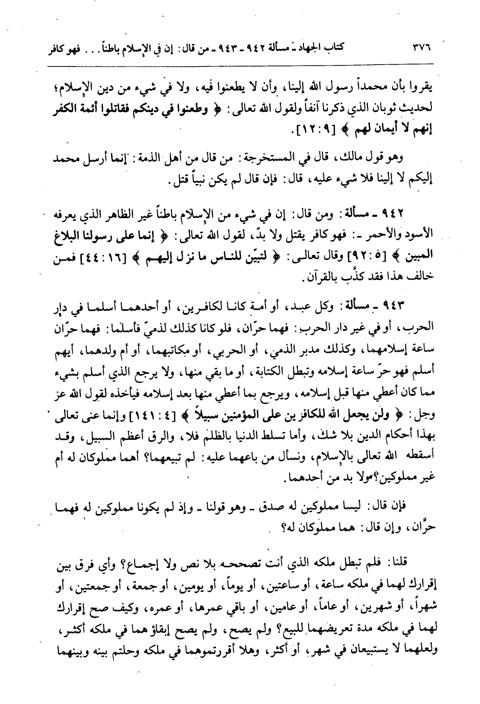 وَمَنْ قَالَ: إنَّ فِي شَيْءٍ مِنْ الْإِسْلَامِ بَاطِنًا غَيْرَ الظَّاهِرِ الَّذِي يَعْرِفهُ الْأَسْوَدُ وَالْأَحْمَرُ، فَهُوَ كَافِرٌ يُقْتَلُ وَلَا بُدَّ، لِقَوْلِ اللَّهِ تَعَالَى: {فَإِنَّمَا عَلَى رَسُولِنَا الْبَلاغُ الْمُبِينُ} [التغابن: 12] وَقَالَ تَعَالَى: {لِتُبَيِّنَ لِلنَّاسِ مَا نُزِّلَ إِلَيْهِمْ} [النحل: 44] فَمَنْ خَالَفَ هَذَا فَقَدْ كَذَّبَ بِالْقُرْآنِ.
