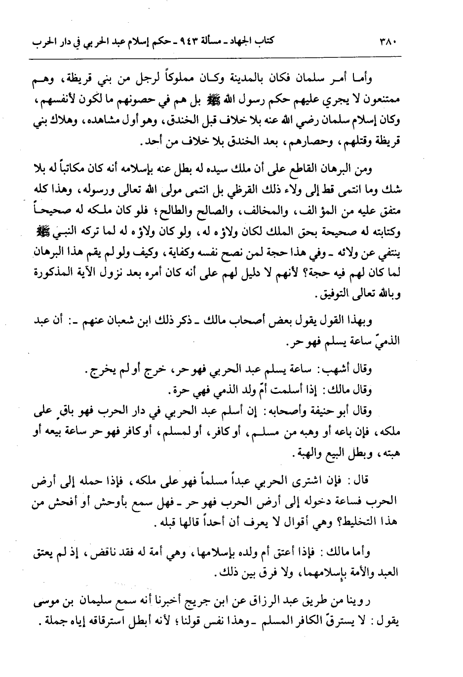 وَمِنْ الْبُرْهَانِ الْقَاطِعِ عَلَى أَنَّ مِلْكَ سَيِّدِهِ لَهُ بَطَلَ عَنْهُ بِإِسْلَامِهِ أَنَّهُ كَانَ مُكَاتَبًا لَهُ بِلَا شَكٍّ وَمَا انْتَمَى قَطُّ إلَى وَلَاءِ ذَلِكَ لْقُرَظِيِّ بَلْ انْتَمَى مَوْلَى اللَّهِ تَعَالَى وَرَسُولِهِ، وَهَذَا كُلُّهُ مُتَّفِقٌ عَلَيْهِ مِنْ الْمُؤَالَفِ، وَالْمُخَالِفِ، وَالصَّالِحِ وَالطَّالِحِ؛ فَلَوْ كَانَ مِلْكُهُ لَهُ صَحِيحًا وَكِتَابَتُهُ لَهُ صَحِيحَةً بِحَقِّ الْمِلْكِ لَكَانَ وَلَاؤُهُ لَهُ، وَلَوْ كَانَ وَلَاؤُهُ لَهُ لَمَا تَرَكَهُ النَّبِيُّ - صَلَّى اللَّهُ عَلَيْهِ وَسَلَّمَ - يَنْتَفِي عَنْ وَلَائِهِ - وَفِي هَذَا حُجَّةٌ لِمَنْ نَصَحَ نَفْسَهُ وَكِفَايَةٌ، وَكَيْف وَلَوْ لَمْ يَقُمْ هَذَا الْبُرْهَانُ لَمَا كَانَ لَهُمْ فِيهِ حُجَّةٌ؟ لِأَنَّهُمْ لَا دَلِيلَ لَهُمْ عَلَى أَنَّهُ كَانَ أَمَرَهُ بَعْدَ نُزُولِ الْآيَةِ الْمَذْكُورَةِ وَبِاَللَّهِ تَعَالَى التَّوْفِيقُ.