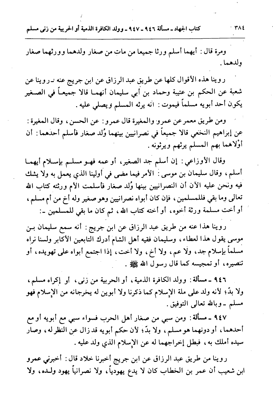 رُوِّينَا مِنْ طَرِيقِ عَبْدِ الرَّزَّاقِ عَنْ ابْنِ جُرَيْجٍ أَخْبَرَنَا خَلَّادٌ قَالَ: أَخْبَرَنِي عَمْرُو بْنُ شُعَيْبٍ أَنَّ عُمَرَ بْنَ الْخَطَّابِ كَانَ لَا يَدْعُ يَهُودِيًّا، وَلَا نَصْرَانِيًّا يُهَوِّدُ وَلَدَهُ، وَلَا