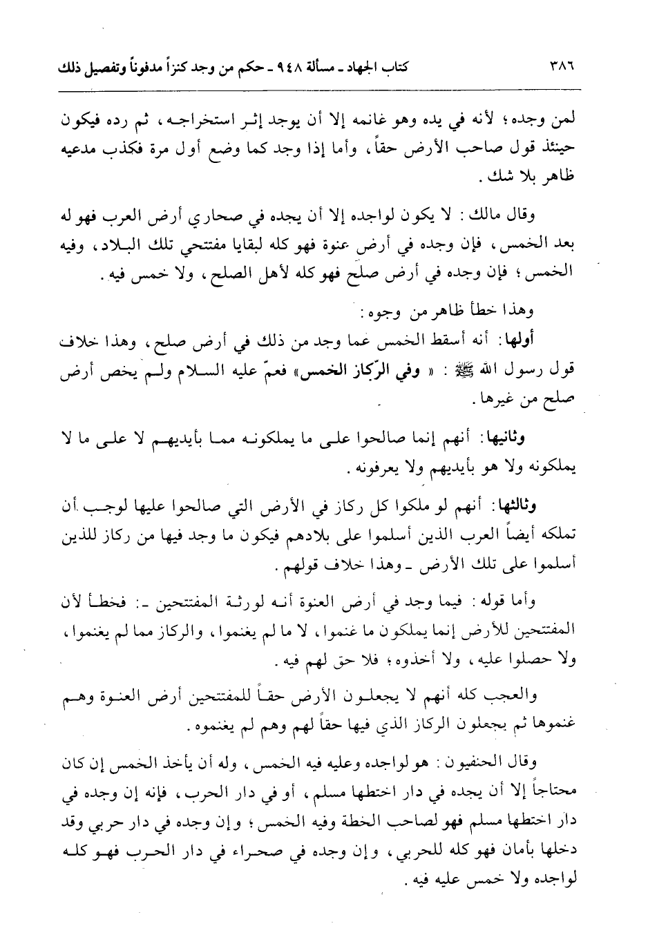 وَهَذَا خَطَأٌ ظَاهِرٌ مِنْ وُجُوهٍ: أَوَّلُهَا: أَنَّهُ أَسْقَطَ الْخُمُسَ عَمَّا وُجِدَ مِنْ ذَلِكَ فِي أَرْضِ صُلْحٍ، وَهَذَا خِلَافُ قَوْلِ رَسُولِ اللَّهِ - صَلَّى اللَّهُ عَلَيْهِ وَسَلَّمَ -: «وَفِي الرِّكَازِ الْخُمُسُ» فَعَمَّ - عَلَيْهِ السَّلَامُ - وَلَمْ يَخُصَّ أَرْضَ صُلْحٍ مِنْ غَيْرِهَا.