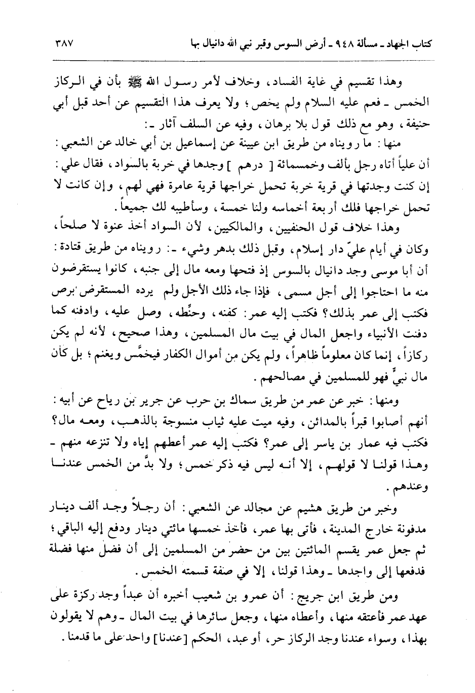 وَهَذَا خِلَافُ قَوْلِ الْحَنَفِيِّينَ، وَالْمَالِكِيِّينَ، لِأَنَّ السَّوَادَ أُخِذَ عَنْوَةً لَا صُلْحًا، وَكَانَ فِي أَيَّامِ عَلِيٍّ دَارَ إسْلَامٍ، وَقَبْلَ ذَلِكَ بِدَهْرٍ، وَشَيْءٌ رُوِّينَاهُ مِنْ طَرِيقِ قَتَادَةَ: أَنَّ أَبَا مُوسَى وَجَدَ دَانْيَالَ بِالسُّوسِ إذْ فَتَحَهَا وَمَعَهُ مَالٌ إلَى جَنْبِهِ، كَانُوا يَسْتَقْرِضُونَ مِنْهُ مَا احْتَاجُوا إلَى أَجَلٍ مُسَمًّى، فَإِذَا جَاءَ ذَلِكَ الْأَجَلُ وَلَمْ يَرُدَّهُ الْمُسْتَقْرِضُ بَرِصَ فَكَتَبَ إلَى عُمَرَ بِذَلِكَ. فَكَتَبَ إلَيْهِ عُمَرُ: كَفِّنْهُ، وَحَنِّطْهُ، وَصَلِّ عَلَيْهِ، وَادْفِنْهُ كَمَا دُفِنَتْ الْأَنْبِيَاءُ وَاجْعَلْ الْمَالَ فِي بَيْتِ مَالِ الْمُسْلِمِينَ، وَهَذَا صَحِيحٌ، لِأَنَّهُ لَمْ يَكُنْ رِكَازًا، إنَّمَا كَانَ مَعْلُومًا ظَاهِرًا، وَلَمْ يَكُنْ مِنْ أَمْوَالِ الْكُفَّارِ فَيُخَمَّسَ وَيُغْنَمَ؛ بَلْ كَانَ مَالَ نَبِيٍّ فَهُوَ لِلْمُسْلِمِينَ فِي مَصَالِحِهِمْ.