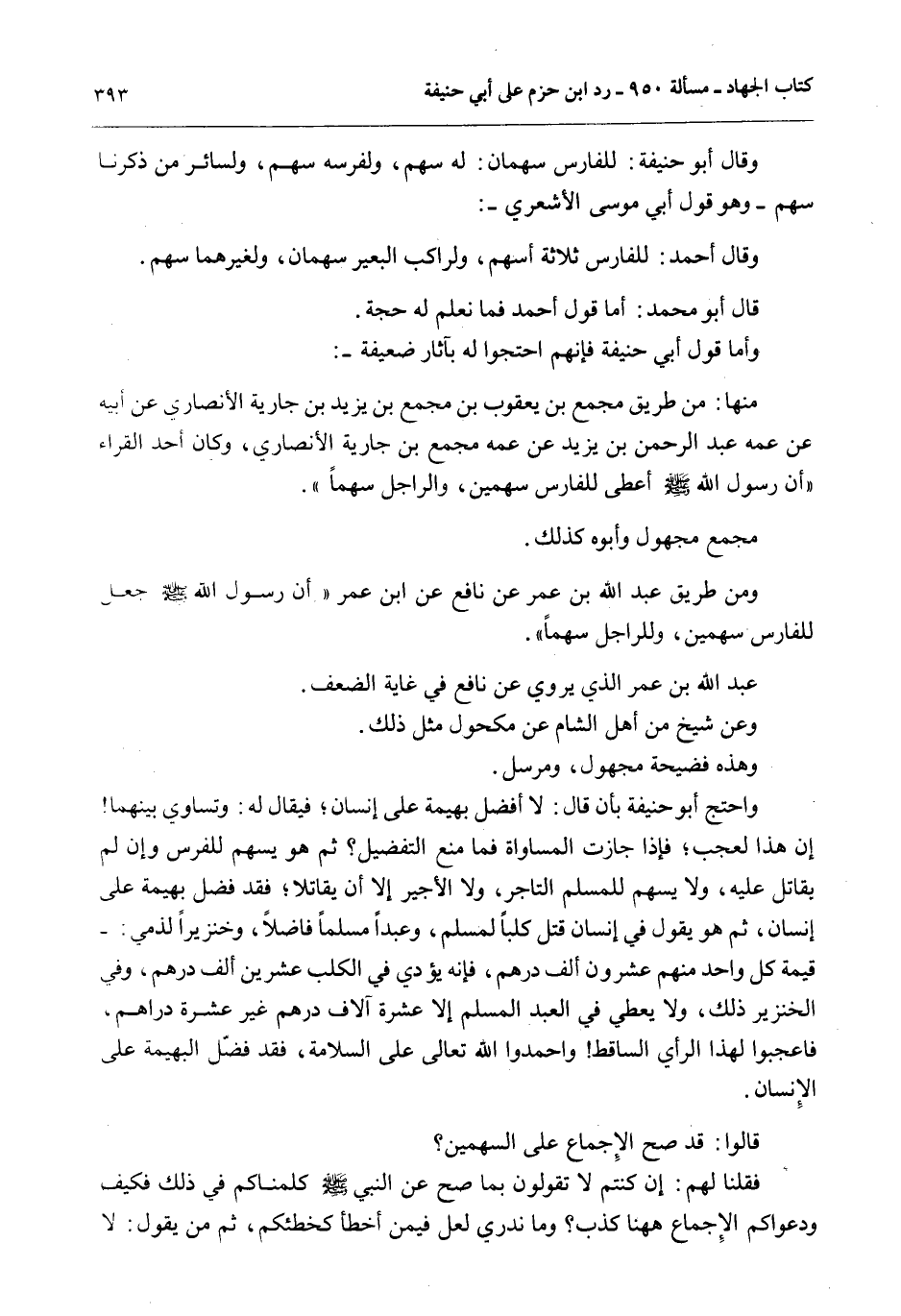 وَأَمَّا قَوْلُ أَبِي حَنِيفَةَ فَإِنَّهُمْ احْتَجُّوا لَهُ بِآثَارٍ ضَعِيفَةٍ. مِنْهَا: مِنْ طَرِيقِ مُجَمِّعِ بْنِ يَعْقُوبَ بْنِ مُجَمِّعِ بْنِ يَزِيدَ بْن جَارِيَةَ الْأَنْصَارِيِّ عَنْ أَبِيهِ عَنْ عَمِّهِ عَبْدِ الرَّحْمَنِ بْنِ يَزِيدَ عَنْ عَمِّهِ مُجَمِّعِ بْنِ جَارِيَةَ الْأَنْصَارِيِّ - وَكَانَ أَحَدَ الْقُرَّاءِ «أَنَّ رَسُولَ اللَّهِ - صَلَّى اللَّهُ عَلَيْهِ وَسَلَّمَ - أَعْطَى لِلْفَارِسِ سَهْمَيْنِ، وَالرَّاجِلِ سَهْمًا» . مُجَمِّعٌ مَجْهُولٌ وَأَبُوهُ كَذَلِكَ.