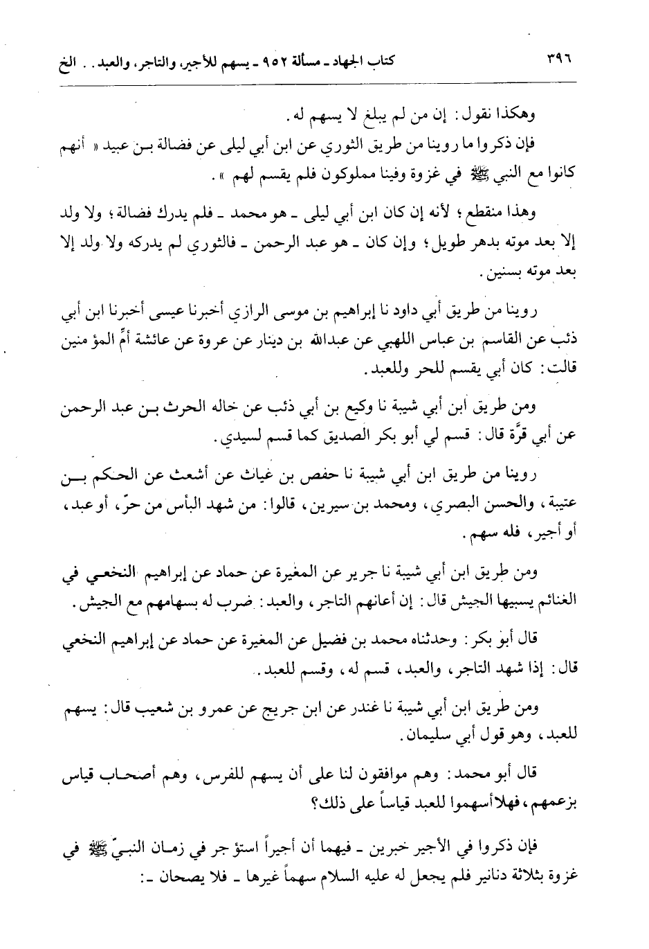 قَالَ أَبُو بَكْرٍ: وَحَدَّثَنَاهُ مُحَمَّدُ بْنُ فُضَيْلٍ عَنْ الْمُغِيرَةِ عَنْ حَمَّادٍ عَنْ إبْرَاهِيمَ النَّخَعِيِّ قَالَ: إذَا شَهِدَ التَّاجِرُ، وَالْعَبْدُ، قُسِمَ لَهُ، وَقُسِمَ لِلْعَبْدِ.