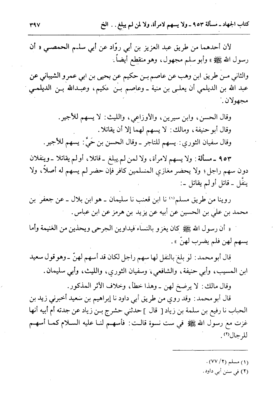 قَالَ أَبُو مُحَمَّدٍ: لَوْ بَلَغَ بِالنَّفْلِ لَهَا سَهْمَ رَاجِلٍ لَكَانَ قَدْ أَسْهَمَ لَهُنَّ - وَهُوَ قَوْلُ سَعِيدِ بْنِ الْمُسَيِّبِ، وَأَبِي حَنِيفَةَ، وَالشَّافِعِيِّ، وَسُفْيَانَ الثَّوْرِيِّ، وَاللَّيْثِ، وَأَبِي سُلَيْمَانَ.