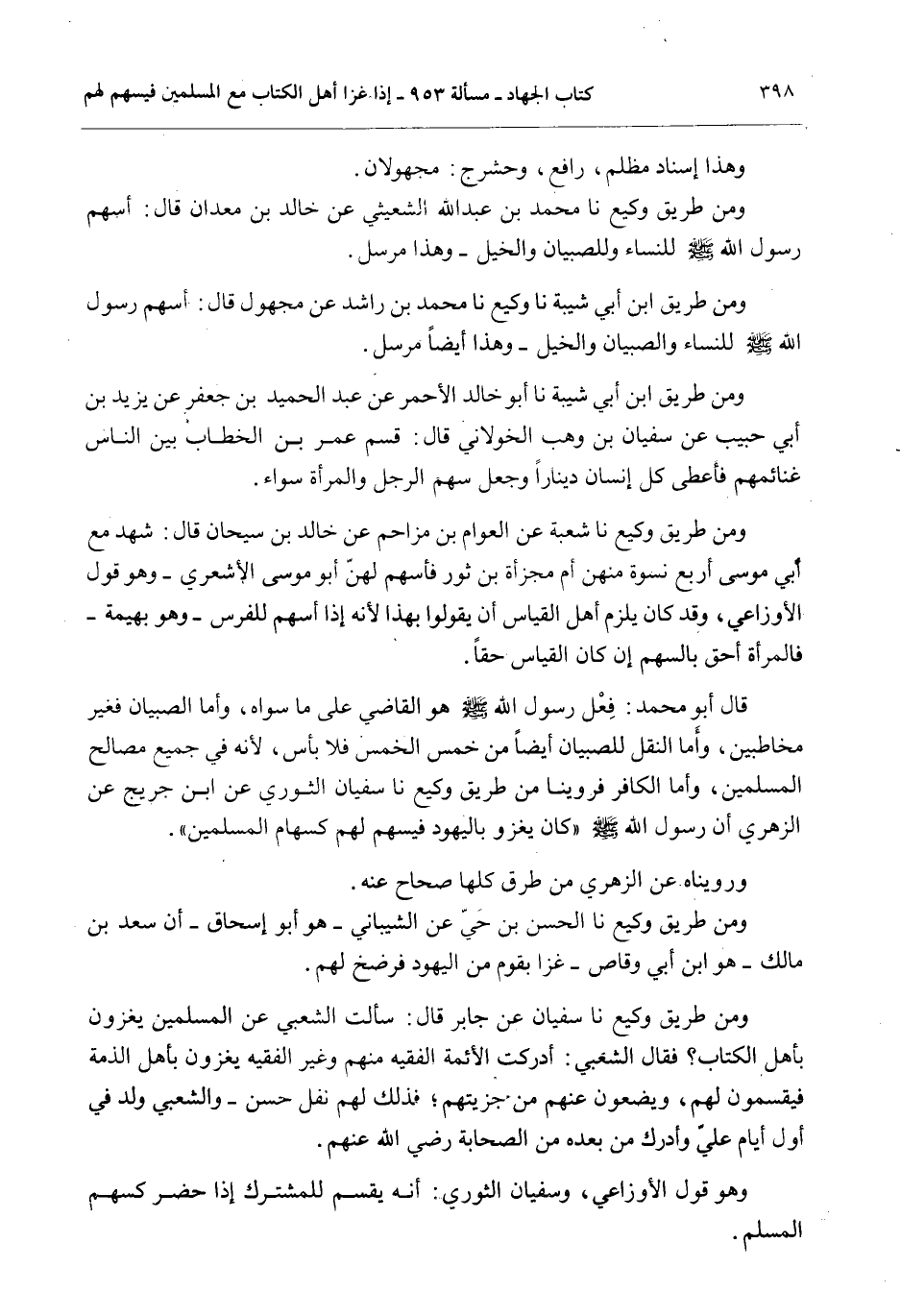 وَمِنْ طَرِيقِ وَكِيعٍ نَا سُفْيَانُ عَنْ جَابِرٍ قَالَ: سَأَلَتْ الشَّعْبِيَّ عَنْ الْمُسْلِمِينَ يَغْزُونَ بِأَهْلِ الْكِتَابِ؟ فَقَالَ الشَّعْبِيُّ: أَدْرَكْت الْأَئِمَّةَ الْفَقِيهَ مِنْهُمْ وَغَيْرَ الْفَقِيهِ يَغْزُونَ بِأَهْلِ الذِّمَّةِ فَيَقْسِمُونَ لَهُمْ، وَيَضَعُونَ عَنْهُمْ مِنْ جِزْيَتِهِمْ؛ فَذَلِكَ لَهُمْ نَفْلٌ حَسَنٌ - وَالشَّعْبِيُّ وُلِدَ فِي أَوَّلِ أَيَّامِ عَلِيٍّ وَأَدْرَكَ مَنْ بَعْدَهُ مِنْ الصَّحَابَةِ - رَضِيَ اللَّهُ عَنْهُمْ -.