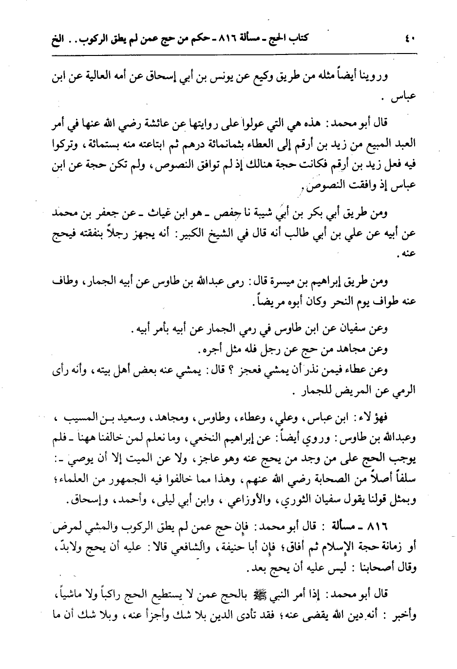 فَهَؤُلَاءِ: ابْنُ عَبَّاسٍ، وَعَلِيٌّ، وَعَطَاءٌ، وَطَاوُسٌ، وَمُجَاهِدٌ، وَسَعِيدُ بْنُ الْمُسَيِّبِ، وَعَبْدُ اللَّهِ بْنُ طَاوُسٍ: وَرُوِيَ أَيْضًا: عَنْ إبْرَاهِيمَ النَّخَعِيِّ، وَمَا نَعْلَمُ لِمَنْ خَالَفَنَا هَاهُنَا - فَلَمْ يُوجِبْ الْحَجَّ عَلَى مَنْ وَجَدَ مَنْ يَحُجُّ عَنْهُ وَهُوَ عَاجِزٌ، وَلَا عَنْ الْمَيِّتِ إلَّا أَنْ يُوصِيَ -: سَلَفًا أَصْلًا مِنْ الصَّحَابَةِ - رَضِيَ اللَّهُ عَنْهُمْ -، وَهَذَا مِمَّا خَالَفُوا فِيهِ الْجُمْهُورَ مِنْ الْعُلَمَاءِ؛ وَبِمِثْلِ قَوْلِنَا يَقُولُ سُفْيَانُ الثَّوْرِيُّ، وَالْأَوْزَاعِيُّ، وَابْنُ أَبِي لَيْلَى، وَأَحْمَدُ، وَإِسْحَاقُ.