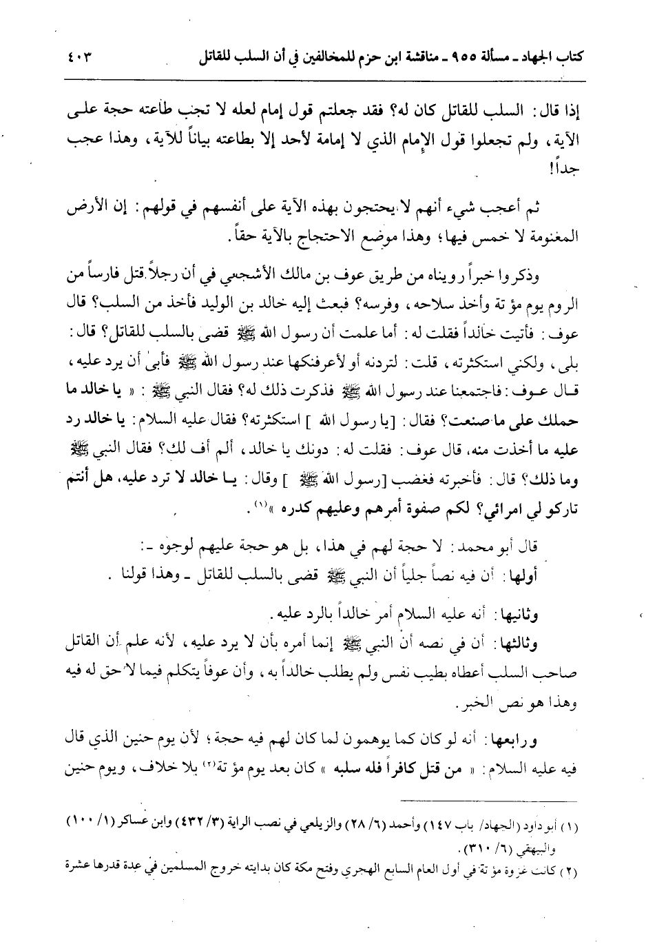 وَرَابِعُهَا: أَنَّهُ لَوْ كَانَ كَمَا يُوهِمُونَ لَمَا كَانَ لَهُمْ فِيهِ حُجَّةٌ، لِأَنَّ يَوْمَ حُنَيْنٍ الَّذِي قَالَ فِيهِ - عَلَيْهِ السَّلَامُ -: «مَنْ قَتَلَ كَافِرًا فَلَهُ سَلَبُهُ» كَانَ بَعْدَ يَوْمِ مُؤْتَةَ، بِلَا خِلَافٍ، وَيَوْمَ حُنَيْنٍ