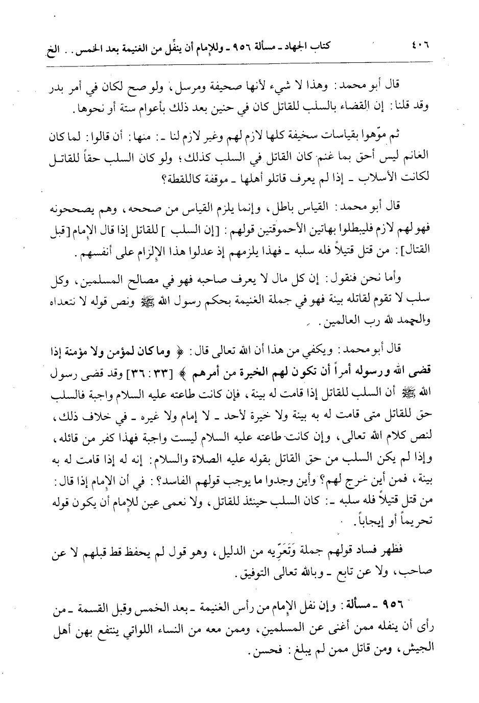 قَالَ أَبُو مُحَمَّدٍ: وَيَكْفِي مِنْ هَذَا أَنَّ اللَّهَ تَعَالَى قَالَ: {وَمَا كَانَ لِمُؤْمِنٍ وَلا مُؤْمِنَةٍ إِذَا قَضَى اللَّهُ وَرَسُولُهُ أَمْرًا أَنْ يَكُونَ لَهُمُ الْخِيَرَةُ مِنْ أَمْرِهِمْ} [الأحزاب: 36] وَقَدْ قَضَى رَسُولُ اللَّهِ - صَلَّى اللَّهُ عَلَيْهِ وَسَلَّمَ - أَنَّ السَّلَبَ لِلْقَاتِلِ إذَا قَامَتْ لَهُ بَيِّنَةٌ، فَإِنْ كَانَتْ طَاعَتُهُ - عَلَيْهِ السَّلَامُ - وَاجِبَةً فَالسَّلَبُ حَقٌّ لِلْقَاتِلِ مَتَى قَامَتْ لَهُ بِهِ بَيِّنَةٌ وَلَا خِيرَةَ لِأَحَدٍ - لَا إمَامٍ وَلَا غَيْرِهِ - فِي خِلَافِ ذَلِكَ، لِنَصِّ كَلَامِ اللَّهِ تَعَالَى، وَإِنْ كَانَتْ طَاعَتُهُ - عَلَيْهِ السَّلَامُ - لَيْسَتْ وَاجِبَةً فَهَذَا كُفْرٌ مِنْ قَائِلِهِ، وَإِذَا لَمْ يَكُنْ السَّلَبُ مِنْ حَقِّ الْقَاتِلِ بِقَوْلِهِ - عَلَيْهِ الصَّلَاةُ وَالسَّلَامُ -: إنَّهُ لَهُ إذَا قَامَتْ لَهُ بِهِ بَيِّنَةٌ، فَمِنْ أَيْنَ خَرَجَ لَهُمْ؟ وَأَيْنَ وَجَدُوا مَا يُوجِبُ قَوْلَهُمْ الْفَاسِدَ؟ : فِي أَنَّ الْإِمَامَ إذَا قَالَ: مَنْ قَتَلَ قَتِيلًا فَلَهُ سَلَبُهُ. كَانَ السَّلَبُ حِينَئِذٍ لِلْقَاتِلِ، وَلَا نُعْمَى عَيْنٍ لِلْإِمَامِ أَنْ يَكُونَ قَوْلُهُ تَحْرِيمًا أَوْ إيجَابًا.