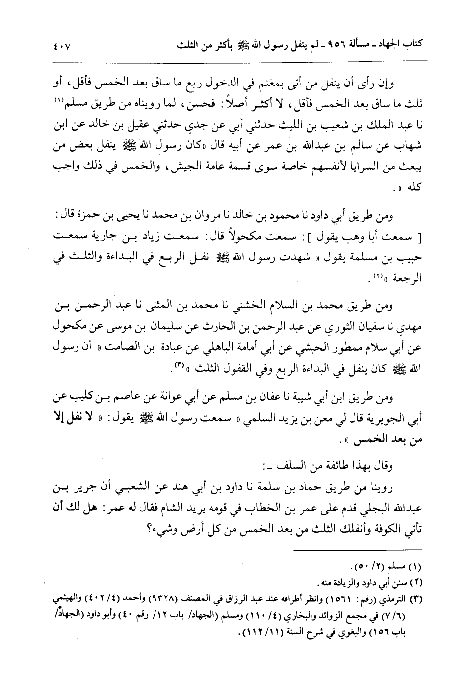وَمِنْ طَرِيقِ أَبِي دَاوُد نَا مَحْمُودُ بْنُ خَالِدٍ نَا مَرْوَانُ بْنُ مُحَمَّدٍ نَا يَحْيَى بْنُ حَمْزَةَ قَالَ: [سَمِعْت: أَبَا وَهْبٍ يَقُولُ] : سَمِعْت مَكْحُولًا قَالَ: سَمِعْتُ زِيَادَ بْنَ جَارِيَةَ سَمِعْتُ حَبِيبَ بْنَ مَسْلَمَةَ يَقُولُ «شَهِدْتُ رَسُولَ اللَّهِ - صَلَّى اللَّهُ عَلَيْهِ وَسَلَّمَ - نَفَلَ الرُّبْعَ فِي الْبَدَاءَةِ وَالثُّلُثَ فِي الرَّجْعَةِ»