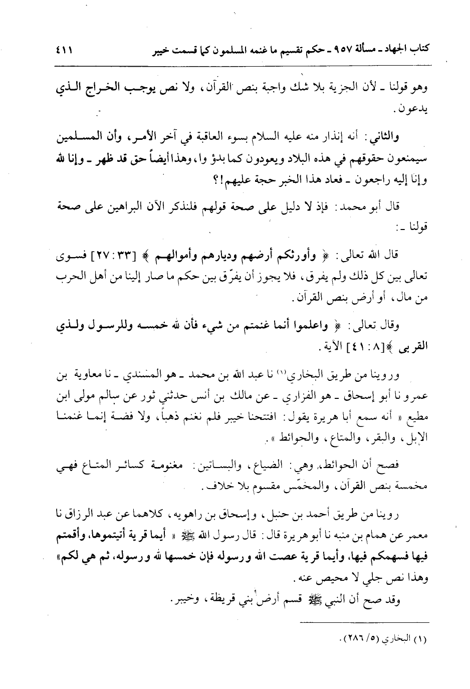 رُوِّينَا مِنْ طَرِيقِ أَحْمَدَ بْنِ حَنْبَلٍ، وَإِسْحَاقَ بْنِ رَاهْوَيْهِ، كِلَاهُمَا عَنْ عَبْدِ الرَّزَّاقِ نَا مَعْمَرٌ عَنْ هَمَّامِ بْنِ مُنَبِّهٍ نَا أَبُو هُرَيْرَةَ قَالَ: قَالَ رَسُولُ اللَّهِ - صَلَّى اللَّهُ عَلَيْهِ وَسَلَّمَ - «أَيُّمَا قَرْيَةٍ أَتَيْتُمُوهَا، وَأَقَمْتُمْ فِيهَا فَسَهْمُكُمْ فِيهَا، وَأَيُّمَا قَرْيَةٍ عَصَتْ اللَّهَ وَرَسُولَهُ فَإِنَّ خُمُسَهَا لِلَّهِ وَرَسُولِهِ، ثُمَّ هِيَ لَكُمْ» وَهَذَا نَصٌّ جَلِيٌّ لَا مَحِيصَ عَنْهُ.