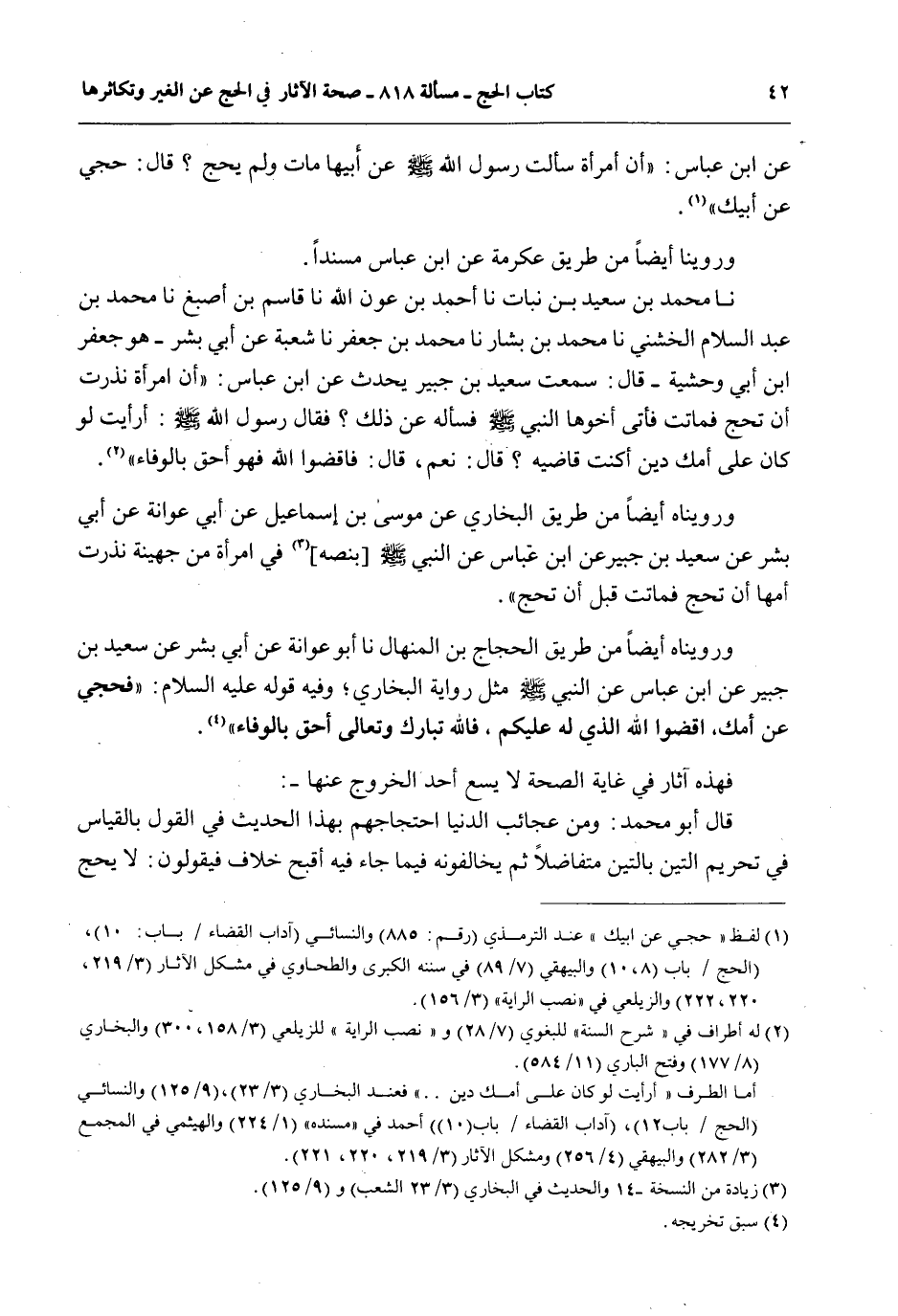 وَرُوِّينَاهُ أَيْضًا مِنْ طَرِيقِ الْبُخَارِيِّ عَنْ مُوسَى بْنِ إسْمَاعِيلَ عَنْ أَبِي عَوَانَةَ عَنْ أَبِي بِشْرٍ عَنْ سَعِيدِ بْنِ جُبَيْرٍ عَنْ ابْنِ عَبَّاسٍ عَنْ النَّبِيِّ - صَلَّى اللَّهُ عَلَيْهِ وَسَلَّمَ -[بِنَصِّهِ] فِي امْرَأَةٍ مِنْ جُهَيْنَةَ نَذَرَتْ أُمُّهَا أَنْ تَحُجَّ فَمَاتَتْ قَبْلَ أَنْ تَحُجَّ ".