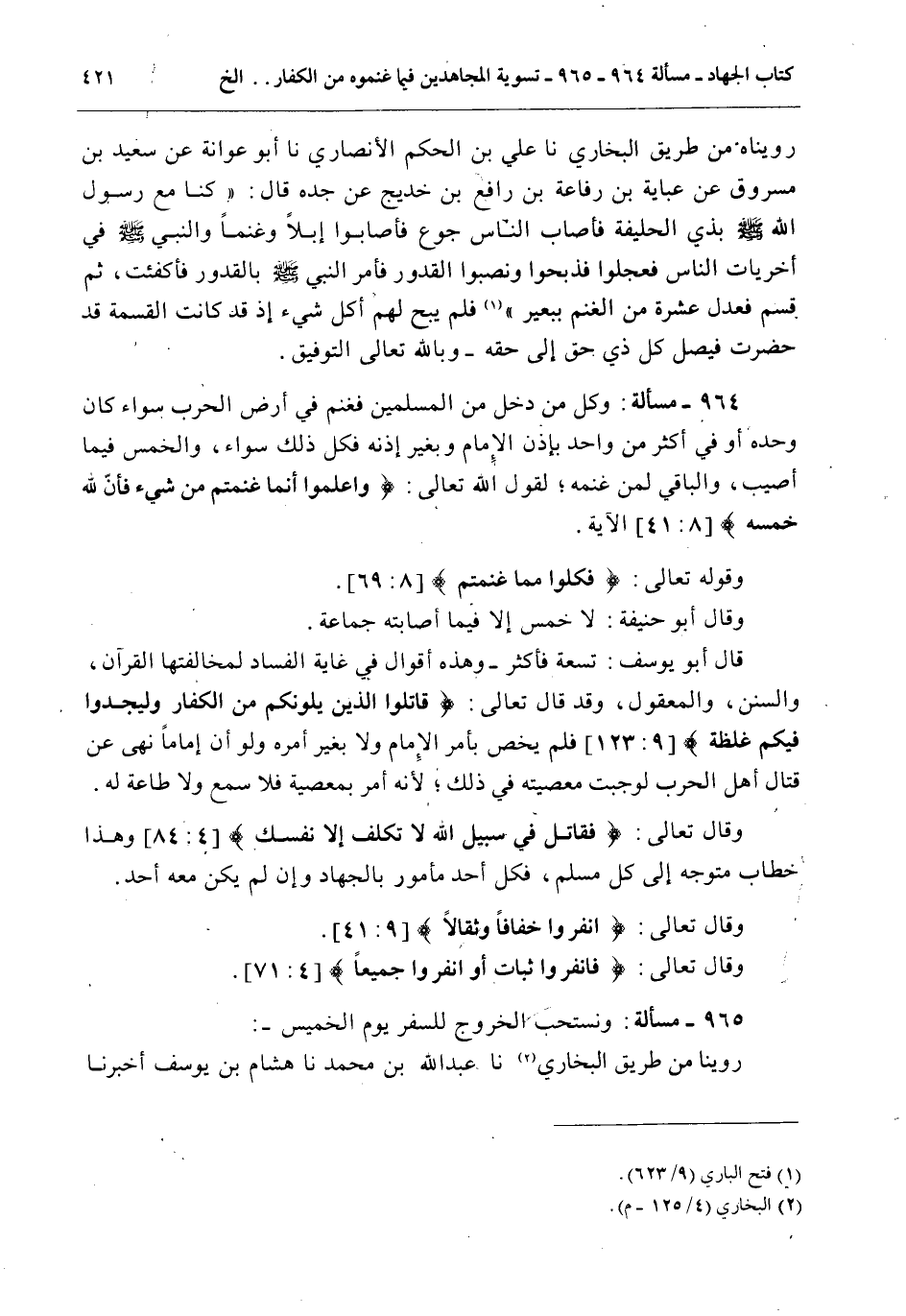 رُوِّينَاهُ مِنْ طَرِيقِ الْبُخَارِيِّ نَا عَلِيُّ بْنُ الْحَكَمِ الْأَنْصَارِيُّ نَا أَبُو عَوَانَةَ عَنْ سَعِيدِ بْنِ مَسْرُوقٍ عَنْ عَبَايَةَ بْنِ رِفَاعَةَ بْنِ رَافِعِ بْنِ خَدِيجٍ عَنْ جَدِّهِ قَالَ: «كُنَّا مَعَ رَسُولِ اللَّهِ - صَلَّى اللَّهُ عَلَيْهِ وَسَلَّمَ - بِذِي الْحُلَيْفَةِ فَأَصَابَ النَّاسَ جُوعٌ فَأَصَابُوا إبِلًا وَغَنَمًا وَالنَّبِيُّ - صَلَّى اللَّهُ عَلَيْهِ وَسَلَّمَ - فِي أُخْرَيَاتِ النَّاسِ فَعَجَّلُوا فَذَبَحُوا وَنَصَبُوا الْقُدُورَ فَأَمَرَ النَّبِيُّ - صَلَّى اللَّهُ عَلَيْهِ وَسَلَّمَ - بِالْقُدُورِ فَأُكْفِئَتْ، ثُمَّ قَسَّمَ فَعَدَلَ عَشَرَةً مِنْ الْغَنَمِ بِبَعِيرٍ» فَلَمْ يُبِحْ لَهُمْ أَكْلَ شَيْءٍ إذْ قَدْ كَانَتْ الْقِسْمَةُ قَدْ حَضَرَتْ فَيَصِلُ كُلُّ ذِي حَقٍّ إلَى حَقِّهِ - وَبِاَللَّهِ تَعَالَى التَّوْفِيقُ.