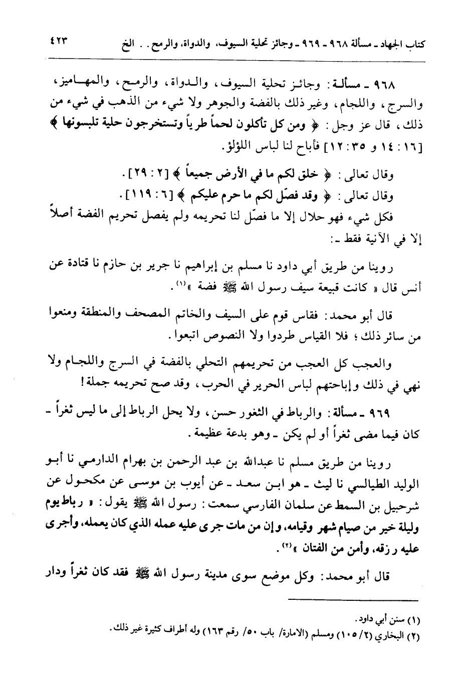 قَالَ أَبُو مُحَمَّدٍ: فَقَاسَ قَوْمٌ عَلَى السَّيْفِ وَالْخَاتَمِ الْمُصْحَفَ وَالْمِنْطَقَةَ وَمَنَعُوا مِنْ سَائِرِ ذَلِكَ؛ فَلَا الْقِيَاسَ طَرَدُوا وَلَا النُّصُوصَ اتَّبَعُوا.