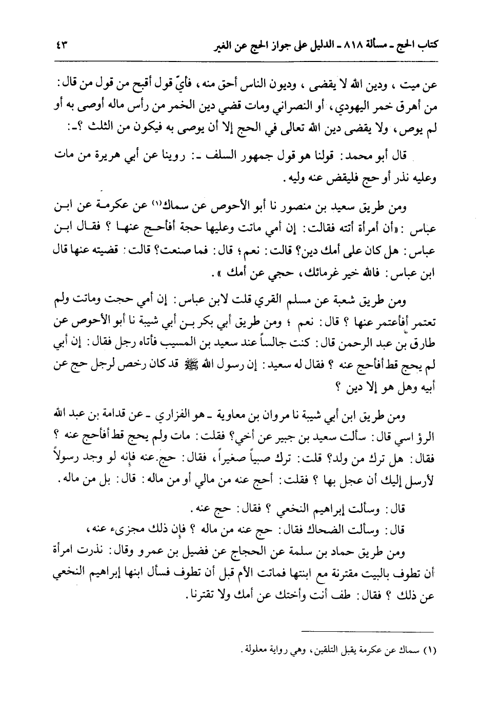 وَمِنْ طَرِيقِ سَعِيدِ بْنِ مَنْصُورٍ نا أَبُو الْأَحْوَصِ عَنْ سِمَاكٍ عَنْ عِكْرِمَةَ عَنْ ابْنِ عَبَّاسٍ: " أَنَّ امْرَأَةً أَتَتْهُ فَقَالَتْ: إنَّ أُمِّي مَاتَتْ وَعَلَيْهَا حَجَّةٌ أَفَأَحُجُّ عَنْهَا؟ فَقَالَ ابْنُ عَبَّاسٍ: هَلْ كَانَ عَلَى أُمِّك دَيْنٌ؟ قَالَتْ: نَعَمْ؛ قَالَ: فَمَا صَنَعْتِ؟ قَالَتْ قَضَيْته عَنْهَا قَالَ ابْنُ عَبَّاسٍ: فَاَللَّهُ خَيْرُ غُرَمَائِك، حُجِّي عَنْ أُمِّك ".
