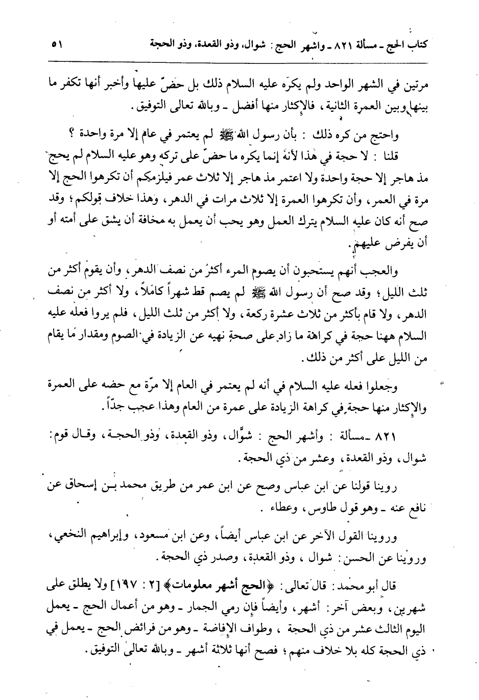 وَأَشْهُرُ الْحَجِّ: شَوَّالٌ، وَذُو الْقِعْدَةِ، وَذُو الْحِجَّةِ، وَقَالَ قَوْمٌ: شَوَّالٌ، وَذُو الْقِعْدَةِ، وَعَشَرٌ مِنْ ذِي الْحِجَّةِ.