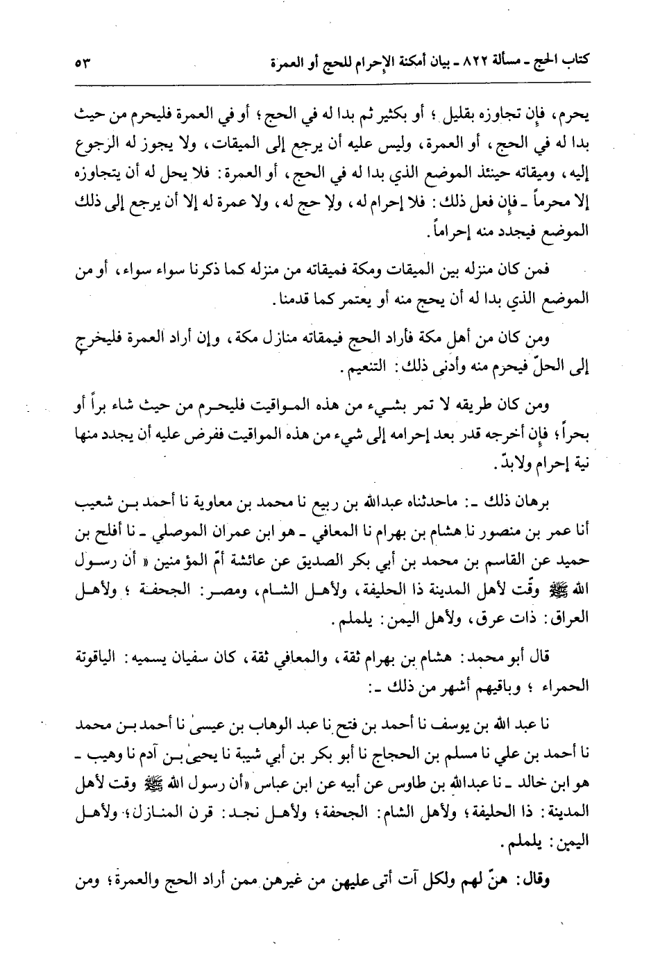 قَالَ أَبُو مُحَمَّدٍ: هِشَامُ بْنُ بَهْرَامُ ثِقَةٌ، وَالْمُعَافِيُّ ثِقَةٌ، كَانَ سُفْيَانُ يُسَمِّيهِ: الْيَاقُوتَةَ الْحَمْرَاءَ؛ وَبَاقِيهِمْ أَشْهَرُ مِنْ ذَلِكَ -: نَا عَبْدُ اللَّهِ بْنُ يُوسُفَ نَا أَحْمَدُ بْنُ فَتْحٍ نَا عَبْدُ الْوَهَّابِ بْنُ عِيسَى نَا أَحْمَدُ بْنُ مُحَمَّدٍ نَا أَحْمَدُ بْنُ عَلِيٍّ نَا مُسْلِمُ بْنُ الْحَجَّاجِ نَا أَبُو بَكْرِ بْنُ أَبِي شَيْبَةَ نَا يَحْيَى بْنُ آدَمَ نَا وُهَيْبٍ هُوَ ابْنُ خَالِدٍ - نَا عَبْدُ اللَّهِ بْنُ طَاوُسٍ عَنْ أَبِيهِ عَنْ ابْنِ عَبَّاسٍ «أَنَّ رَسُولَ اللَّهِ - صَلَّى اللَّهُ عَلَيْهِ وَسَلَّمَ - وَقَّتَ لِأَهْلِ الْمَدِينَةِ: ذَا الْحُلَيْفَةِ؛ وَلِأَهْلِ الشَّامِ: الْجُحْفَةَ، وَلِأَهْلِ نَجْدٍ: قَرْنَ الْمَنَازِلِ، وَلِأَهْلِ الْيَمَنِ: يَلَمْلَمُ. وَقَالَ: هُنَّ لَهُمْ وَلِكُلِّ آتٍ أَتَى عَلَيْهِنَّ مِنْ غَيْرِهِنَّ مِمَّنْ أَرَادَ الْحَجَّ وَالْعُمْرَةَ، وَمَنْ