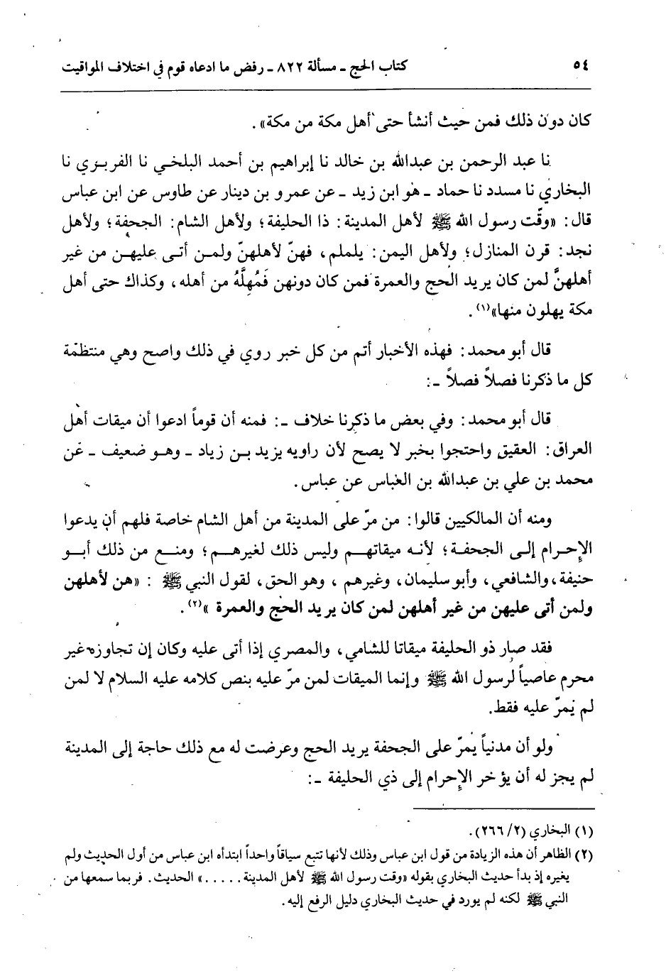 نَا عَبْدُ الرَّحْمَنِ بْنُ عَبْدِ اللَّهِ بْنِ خَالِدٍ نَا إبْرَاهِيمُ بْنُ أَحْمَدَ الْبَلْخِيّ نَا الْفَرَبْرِيُّ نَا الْبُخَارِيُّ نَا مُسَدَّدٌ نَا حَمَّادٌ هُوَ ابْنُ زَيْدٍ - عَنْ عَمْرِو بْنِ دِينَارٍ عَنْ طَاوُسٍ عَنْ ابْنِ عَبَّاسٍ قَالَ: «وَقَّتَ رَسُولُ اللَّهِ - صَلَّى اللَّهُ عَلَيْهِ وَسَلَّمَ - لِأَهْلِ الْمَدِينَةِ: ذَا الْحُلَيْفَةِ؛ وَلِأَهْلِ الشَّامِ: الْجُحْفَةَ؛ وَلِأَهْلِ نَجْدٍ: قَرْنَ الْمَنَازِلِ؛ وَلِأَهْلِ الْيَمَنِ: يَلَمْلَمُ، فَهُنَّ لِأَهْلِهِنَّ وَلِمَنْ أَتَى عَلَيْهِنَّ مِنْ غَيْرِ أَهْلِهِنَّ لِمَنْ كَانَ يُرِيدُ الْحَجَّ وَالْعُمْرَةَ فَمَنْ كَانَ دُونَهُنَّ فَمُهِلُّهُ مِنْ أَهْلِهِ، وَكَذَاكَ حَتَّى أَهْلُ مَكَّةَ يُهِلُّونَ مِنْهَا» .