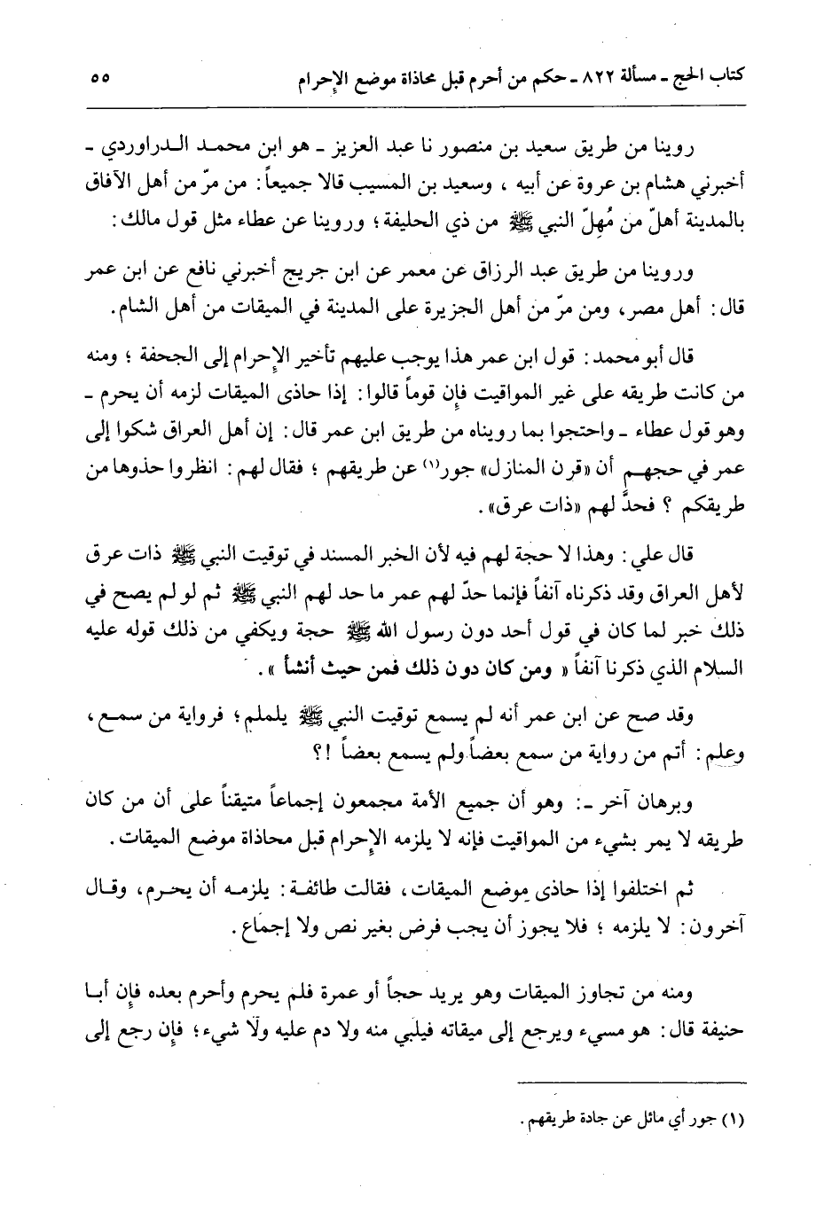 قَالَ أَبُو مُحَمَّدٍ: قَوْلُ ابْنِ عُمَرَ هَذَا يُوجِبُ عَلَيْهِمْ تَأْخِيرَ الْإِحْرَامِ إلَى الْجُحْفَةِ؛ وَمِنْهُ مَنْ كَانَتْ طَرِيقُهُ عَلَى غَيْرِ الْمَوَاقِيتِ فَإِنَّ قَوْمًا قَالُوا: إذَا حَاذَى الْمِيقَاتَ لَزِمَهُ أَنْ يُحْرِمَ - وَهُوَ قَوْلُ عَطَاءٍ - وَاحْتَجُّوا بِمَا رُوِّينَاهُ مِنْ طَرِيقِ ابْنِ عُمَرَ قَالَ: إنَّ أَهْلَ الْعِرَاقِ شَكَوْا إلَى عُمَرَ فِي حَجِّهِمْ أَنَّ " قَرْنَ الْمَنَازِلِ " جَوْرٌ عَنْ طَرِيقِهِمْ؛ فَقَالَ لَهُمْ: اُنْظُرُوا حَذْوَهَا مِنْ طَرِيقِكُمْ؟ فَحَدَّ لَهُمْ " ذَاتَ عِرْقٍ ".