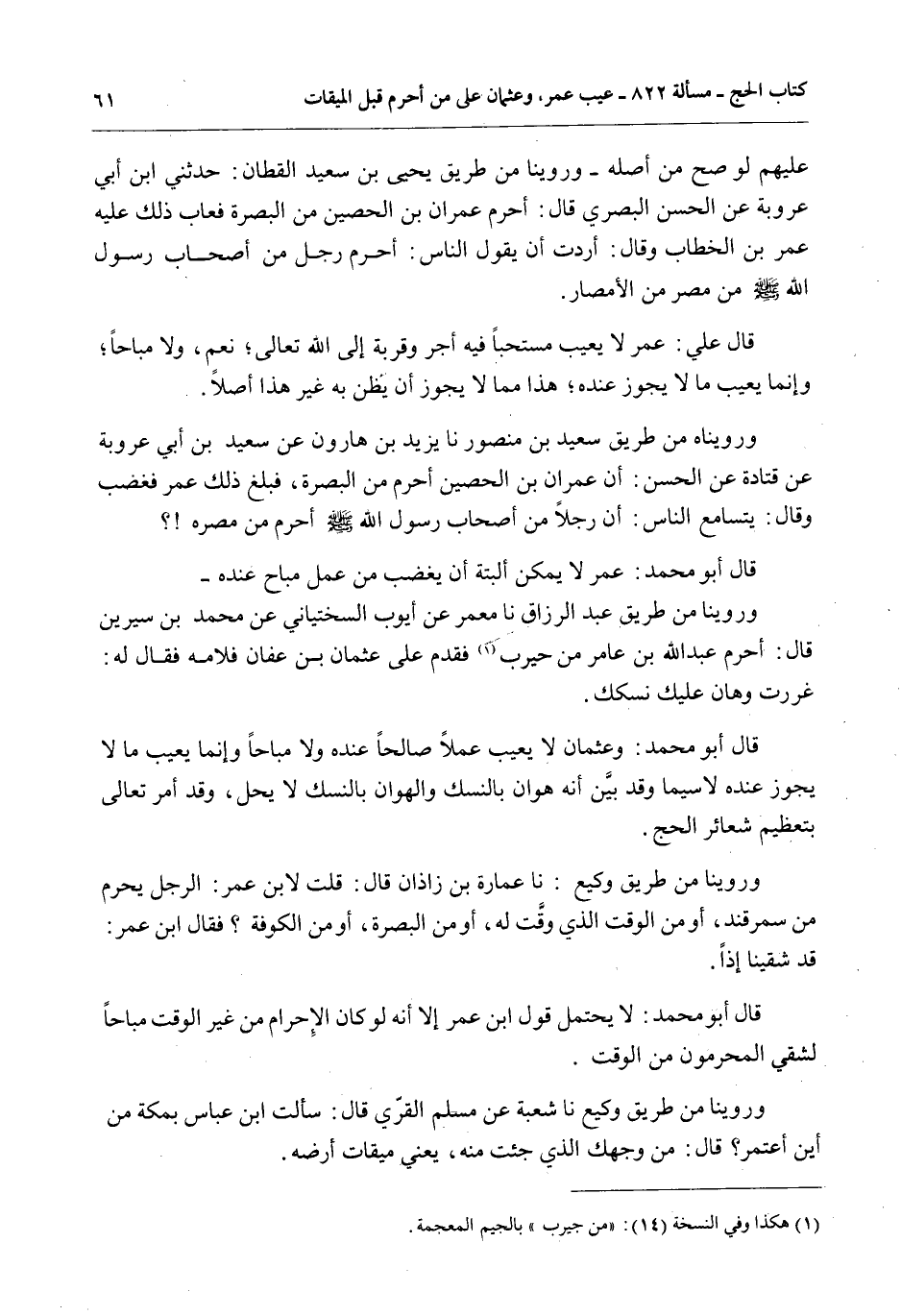 وَرُوِّينَاهُ مِنْ طَرِيقِ سَعِيدِ بْنِ مَنْصُورٍ نَا يَزِيدُ بْنُ هَارُونَ عَنْ سَعِيدِ بْنِ أَبِي عَرُوبَةَ عَنْ قَتَادَةَ عَنْ الْحَسَنِ: أَنَّ عِمْرَانَ بْنَ الْحُصَيْنِ أَحْرَمَ مِنْ الْبَصْرَةِ، فَبَلَغَ ذَلِكَ عُمَرَ فَغَضِبَ وَقَالَ: يَتَسَامَعُ النَّاسُ: أَنَّ رَجُلًا مِنْ أَصْحَابِ رَسُولِ اللَّهِ - صَلَّى اللَّهُ عَلَيْهِ وَسَلَّمَ - أَحْرَمَ مِنْ مِصْرِهِ؟ قَالَ أَبُو مُحَمَّدٍ: عُمَرُ لَا يُمْكِنُ أَلْبَتَّةَ أَنْ يَغْضَبَ مِنْ عَمَلٍ مُبَاحٍ عِنْدَهُ - وَرُوِّينَا مِنْ طَرِيقِ عَبْدِ الرَّزَّاقِ نَا مَعْمَرٌ عَنْ أَيُّوبَ السِّخْتِيَانِيُّ عَنْ مُحَمَّدِ بْنِ سِيرِينَ قَالَ: أَحْرَمَ عَبْدُ اللَّهِ بْنُ عَامِرٍ مِنْ حَيْرَبٍ فَقَدِمَ عَلَى عُثْمَانَ بْنِ عَفَّانَ فَلَامَهُ فَقَالَ لَهُ: غَرَرْت وَهَانَ عَلَيْك نُسُكُك.