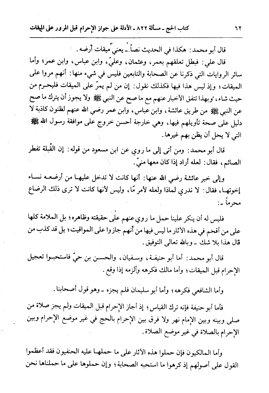 قَالَ عَلِيٌّ: فَبَطَلَ تَعَلُّقُهُمْ بِعُمَرَ، وَعُثْمَانَ، وَعَلِيٍّ، وَابْنِ عَبَّاسٍ، وَابْنِ عُمَرَ؛ وَأَمَّا سَائِرُ الرِّوَايَاتِ الَّتِي ذَكَرْنَا عَنْ الصَّحَابَةِ وَالتَّابِعِينَ فَلَيْسَ فِي شَيْءٍ مِنْهَا: أَنَّهُمْ مَرُّوا عَلَى الْمِيقَاتِ؛ وَإِذْ لَيْسَ هَذَا فِيهَا فَكَذَلِكَ نَقُولُ: إنَّ مَنْ لَمْ يَمُرَّ عَلَى الْمِيقَاتِ فَلْيُحْرِمْ مِنْ حَيْثُ شَاءَ، وَبِهَذَا تَتَّفِقُ الْأَخْبَارُ عَنْهُمْ مَعَ مَا صَحَّ عَنْ النَّبِيِّ - صَلَّى اللَّهُ عَلَيْهِ وَسَلَّمَ - وَلَا يَجُوزُ أَنْ يُتْرَكَ مَا صَحَّ عَنْ النَّبِيِّ - صَلَّى اللَّهُ عَلَيْهِ وَسَلَّمَ - مِنْ طَرِيقِ عَائِشَةَ، وَابْنِ عَبَّاسٍ، وَابْنِ عُمَرَ - رَضِيَ اللَّهُ عَنْهُمْ - لِظُنُونٍ كَاذِبَةٍ لَا دَلِيلَ عَلَى صِحَّةِ تَأْوِيلِهِمْ فِيهَا، وَهِيَ خَارِجَةٌ أَحْسَنَ خُرُوجٍ عَلَى مُوَافَقَةِ رَسُولِ اللَّهِ - صَلَّى اللَّهُ عَلَيْهِ وَسَلَّمَ - الَّتِي لَا يَحِلُّ أَنْ يُظَنَّ بِهِمْ غَيْرُهَا.