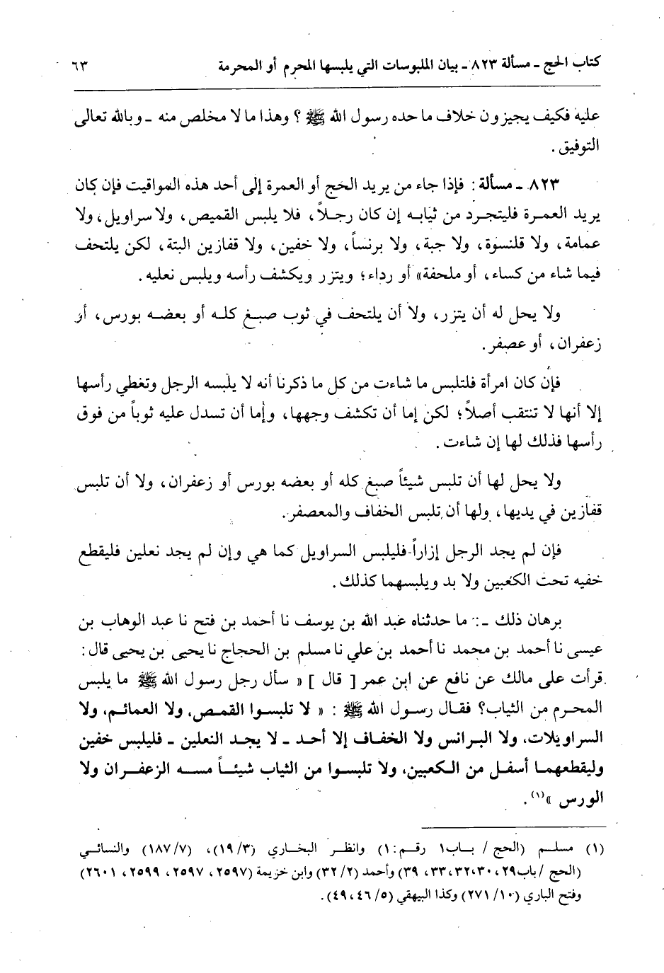 بُرْهَانُ ذَلِكَ -: مَا حَدَّثَنَاهُ عَبْدُ اللَّهِ بْنُ يُوسُفَ نَا أَحْمَدُ بْنُ فَتْحٍ نَا عَبْدُ الْوَهَّابِ بْنُ عِيسَى نَا أَحْمَدُ بْنُ مُحَمَّدٍ نَا أَحْمَدُ بْنُ عَلِيٍّ نَا مُسْلِمُ بْنُ الْحَجَّاجِ نَا يَحْيَى بْنُ يَحْيَى قَالَ: قَرَأْت عَلَى مَالِكٍ عَنْ نَافِعٍ عَنْ ابْنِ عُمَرَ [قَالَ] «سَأَلَ رَجُلٌ رَسُولَ اللَّهِ - صَلَّى اللَّهُ عَلَيْهِ وَسَلَّمَ - مَا يَلْبَسُ الْمُحْرِمُ مِنْ الثِّيَابِ؟ فَقَالَ رَسُولُ اللَّهِ - صَلَّى اللَّهُ عَلَيْهِ وَسَلَّمَ -: لَا تَلْبَسُوا الْقُمُصَ، وَلَا الْعَمَائِمَ، وَلَا السَّرَاوِيلَاتِ، وَلَا الْبَرَانِسَ وَلَا الْخِفَافَ إلَّا أَحَدٌ - لَا يَجِدُ النَّعْلَيْنِ - فَلْيَلْبَسْ خُفَّيْنِ وَلْيَقْطَعْهُمَا أَسْفَلَ مِنْ الْكَعْبَيْنِ، وَلَا تَلْبَسُوا مِنْ الثِّيَابِ شَيْئًا مَسَّهُ الزَّعْفَرَانُ وَلَا الْوَرْسُ» .