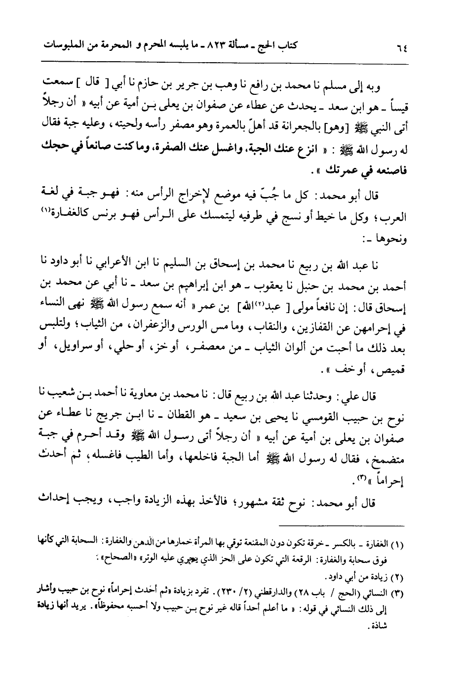 قَالَ أَبُو مُحَمَّدٍ: كُلُّ مَا جُبَّ فِيهِ مَوْضِعٌ لِإِخْرَاجِ الرَّأْسِ مِنْهُ: فَهُوَ جُبَّةٌ فِي لُغَةِ الْعَرَبِ؛ وَكُلُّ مَا خِيطَ أَوْ نُسِجَ فِي طَرَفَيْهِ لِيَتَمَسَّكَ عَلَى الرَّأْسِ فَهُوَ بُرْنُسٌ كَالْغِفَارَةِ وَنَحْوِهَا -: نَا عَبْدُ اللَّهِ بْنُ رَبِيعٍ نَا مُحَمَّدُ بْنُ إِسْحَاقَ بْنِ السُّلَيْمِ نَا ابْنُ الْأَعْرَابِيِّ نَا أَبُو دَاوُد نَا أَحْمَدُ بْنُ مُحَمَّدِ بْنِ حَنْبَلٍ نَا يَعْقُوبُ هُوَ ابْنُ إبْرَاهِيمَ بْنِ سَعْدٍ - نَا أَبِي عَنْ مُحَمَّدُ بْنُ إِسْحَاقَ قَالَ: إنَّ نَافِعًا مَوْلَى عَبْدِ اللَّهِ بْنِ عُمَرَ " أَنَّهُ سَمِعَ رَسُولَ اللَّهِ - صَلَّى اللَّهُ عَلَيْهِ وَسَلَّمَ - «نَهَى النِّسَاءَ فِي إحْرَامِهِنَّ عَنْ الْقُفَّازَيْنِ، وَالنِّقَابِ، وَمَا مَسَّ الْوَرْسُ وَالزَّعْفَرَانُ، مِنْ الثِّيَابِ وَلْتَلْبَسْ بَعْدَ ذَلِكَ مَا أَحَبَّتْ مِنْ أَلْوَانِ الثِّيَابِ - مِنْ مُعَصْفَرٍ، أَوْ خَزٍّ، أَوْ حُلِيٍّ، أَوْ سَرَاوِيلَ، أَوْ قَمِيصٍ، أَوْ خُفٍّ» .