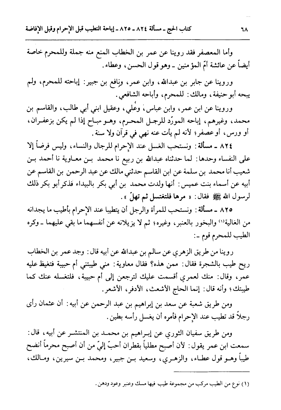 وَنَسْتَحِبُّ لِلْمَرْأَةِ وَالرَّجُلِ أَنْ يَتَطَيَّبَا عِنْدَ الْإِحْرَامِ بِأَطْيَبَ مَا يَجِدَانِهِ مِنْ الْغَالِيَةِ وَالْبَخُورِ بِالْعَنْبَرِ، وَغَيْرِهِ؛ ثُمَّ لَا يُزِيلَانِهِ عَنْ أَنْفُسِهِمَا مَا بَقِيَ عَلَيْهِمَا - وَكُرِهَ الطِّيبُ لِلْمُحْرِمِ قَوْمٌ -: رُوِّينَا مِنْ طَرِيقِ الزُّهْرِيِّ عَنْ سَالِمِ بْنِ عَبْدِ اللَّهِ عَنْ أَبِيهِ قَالَ: وَجَدَ عُمَرُ بْنُ الْخَطَّابِ رِيحَ طِيبٍ بِالشَّجَرَةِ فَقَالَ: مِمَّنْ هَذِهِ؟ فَقَالَ مُعَاوِيَةُ: مِنِّي طَيَّبَتْنِي أُمُّ حَبِيبَةَ فَتَغَيَّظَ عَلَيْهِ عُمَرُ، وَقَالَ: مِنْك لَعَمْرِي أَقْسَمْت عَلَيْك لَتَرْجِعَن إلَى أُمِّ حَبِيبَةَ، فَلْتَغْسِلْهُ عَنْك كَمَا طَيَّبَتْكَ؛ وَأَنَّهُ قَالَ: إنَّمَا الْحَاجُّ الْأَشْعَثُ، الْأَدْفَرُ، الْأَشْعَرُ.