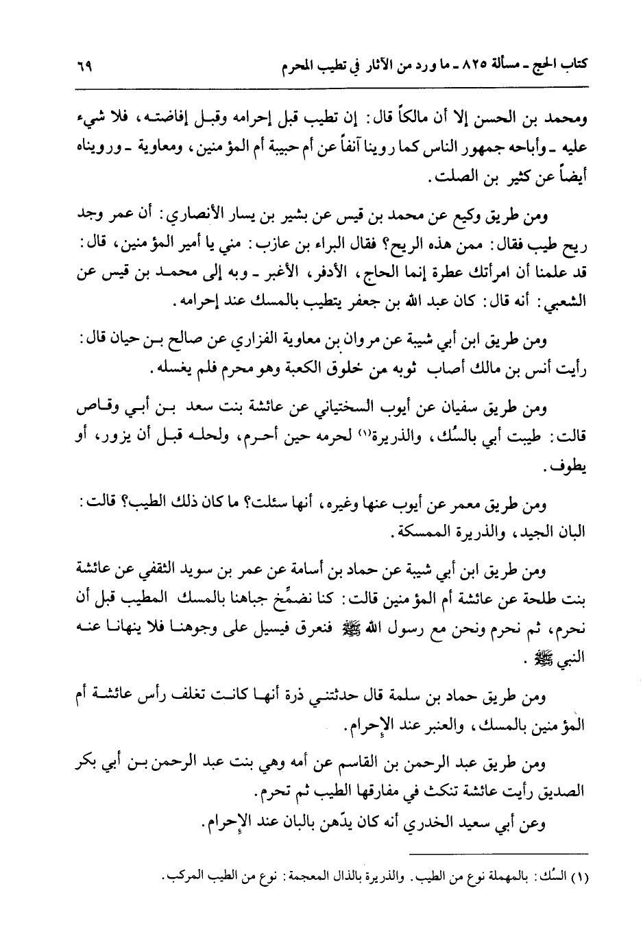 وَمِنْ طَرِيقِ ابْنِ أَبِي شَيْبَةَ عَنْ حَمَّادِ بْنِ أُسَامَةَ عَنْ عُمَرَ بْنِ سُوَيْد الثَّقَفِيِّ عَنْ عَائِشَةَ بِنْتِ طَلْحَةَ عَنْ عَائِشَةَ أُمِّ الْمُؤْمِنِينَ قَالَتْ: كُنَّا نُضَمِّخُ جِبَاهَنَا بِالْمِسْكِ الْمُطَيَّبِ قَبْلَ أَنْ نُحْرِمَ، ثُمَّ نُحْرِمَ وَنَحْنُ مَعَ رَسُولِ اللَّهِ - صَلَّى اللَّهُ عَلَيْهِ وَسَلَّمَ - فَنَعْرَقُ فَيَسِيلُ عَلَى وُجُوهِنَا فَلَا يَنْهَانَا عَنْهُ النَّبِيُّ - صَلَّى اللَّهُ عَلَيْهِ وَسَلَّمَ -.