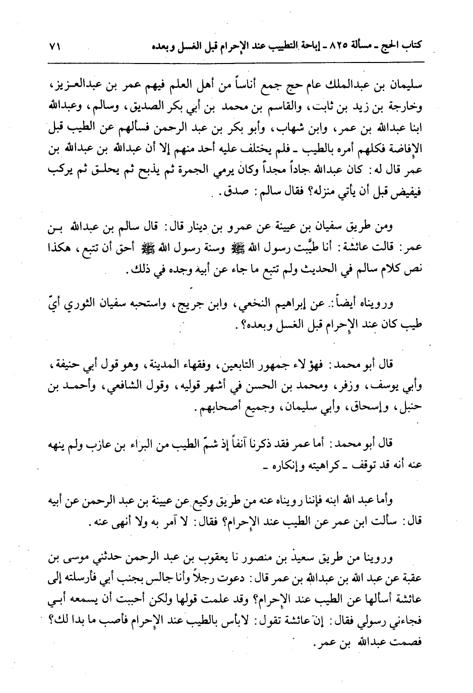 سُلَيْمَانَ بْنَ عَبْدِ الْمَلِكِ عَامَ حَجَّ جَمَعَ أُنَاسًا مِنْ أَهْلِ الْعِلْمِ فِيهِمْ عُمَرُ بْنُ عَبْدِ الْعَزِيزِ، وَخَارِجَةُ بْنُ زَيْدِ بْنِ ثَابِتٍ، وَالْقَاسِمُ بْنُ مُحَمَّدِ بْنِ أَبِي بَكْرٍ الصِّدِّيقِ، وَسَالِمٌ، وَعَبْدُ اللَّهِ ابْنَا عَبْدِ اللَّهِ بْنِ عُمَرَ، وَابْنُ شِهَابٍ، وَأَبُو بَكْرِ بْنُ عَبْدِ الرَّحْمَنِ فَسَأَلَهُمْ عَنْ الطِّيبِ قَبْلَ الْإِفَاضَةِ فَكُلُّهُمْ أَمَرَهُ بِالطِّيبِ - فَلَمْ يَخْتَلِفْ عَلَيْهِ أَحَدٌ مِنْهُمْ إلَّا أَنَّ عَبْدَ اللَّهِ بْنَ عَبْدِ اللَّهِ بْنِ عُمَرَ قَالَ لَهُ: كَانَ عَبْدُ اللَّهِ جَادًّا مُجِدًّا وَكَانَ يَرْمِي الْجَمْرَةَ ثُمَّ يَذْبَحُ ثُمَّ يَحْلِقُ ثُمَّ يَرْكَبُ فَيُفِيضُ قَبْلَ أَنْ يَأْتِيَ مَنْزِلَهُ؟ فَقَالَ سَالِمٌ: صَدَقَ.